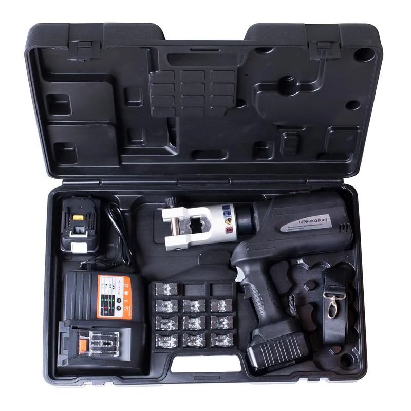 Прочный пластиковый кейс со специальными отсеками для инструмента, двух аккумуляторов, зарядного устройства и комплекта сменных матриц