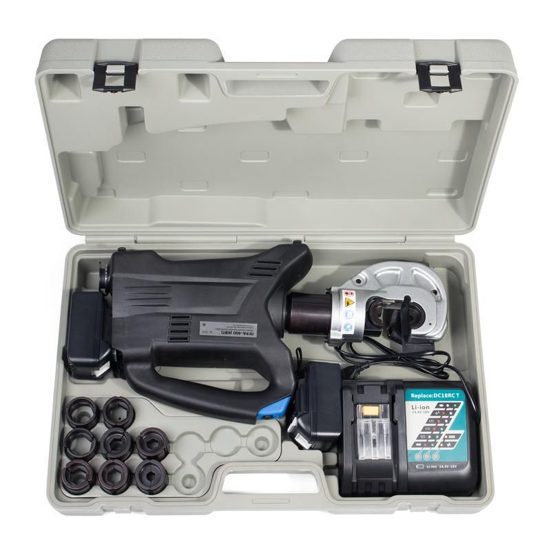 13-тонный аккумуляторный пресс с гидравлическим приводом для опрессовки медных и алюминиевых наконечников. Инновационный корпус с плавными обтекаемыми линиями и прорезиненными вставками в основании
