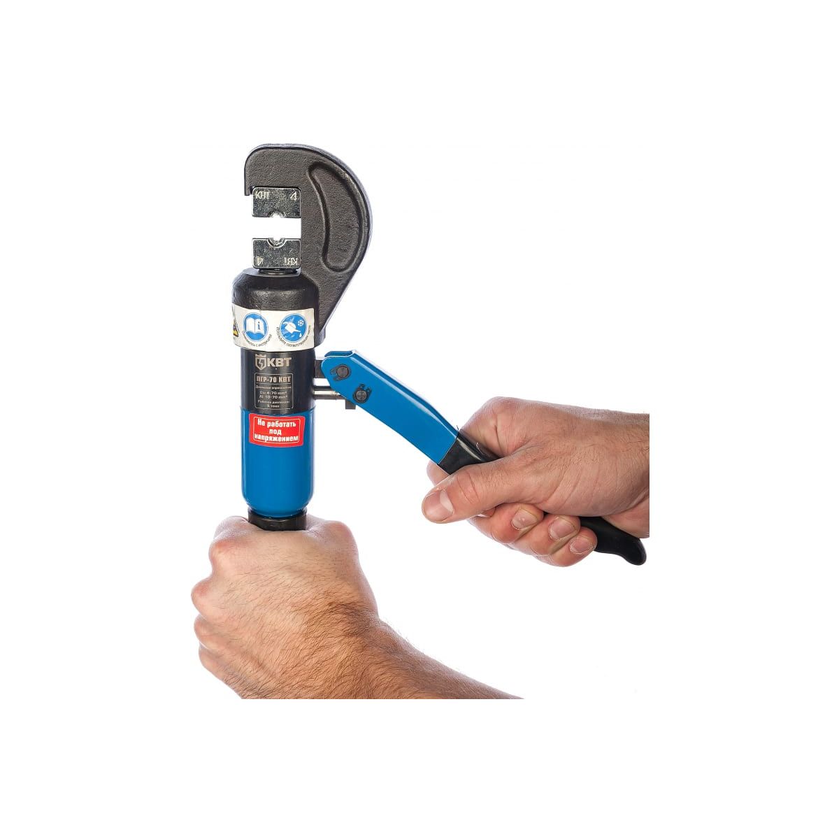 Пресс гидравлический ПГР-70 (КВТ) предназначен для обжима наконечников медных и алюминиевых кабелей сечением от 4 до 70 мм. Инструмент имеет компактные размеры, С-образную стальную голову для эффективной обработки кабеля и гексагональный профиль для надежной фиксации матрицы. Максимально возможное усилие — 5 тонн. Комфорт эксплуатации достигается широким диапазоном рабочих температур (от -15 до +50 °С), эргономичной формой ручек с плавной регулировкой усилия, простотой управления и долговечностью конструкции. В комплектацию входят 8 безлюфтовых сменных насадок с штифтовой фиксацией, ремкомплект, состоящий из уплотнительных резинок и удобный кейс для хранения из износостойкого пластика для хранения. Срок плановой замены масла в узле — 2 года.