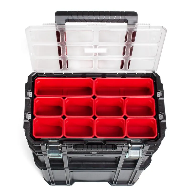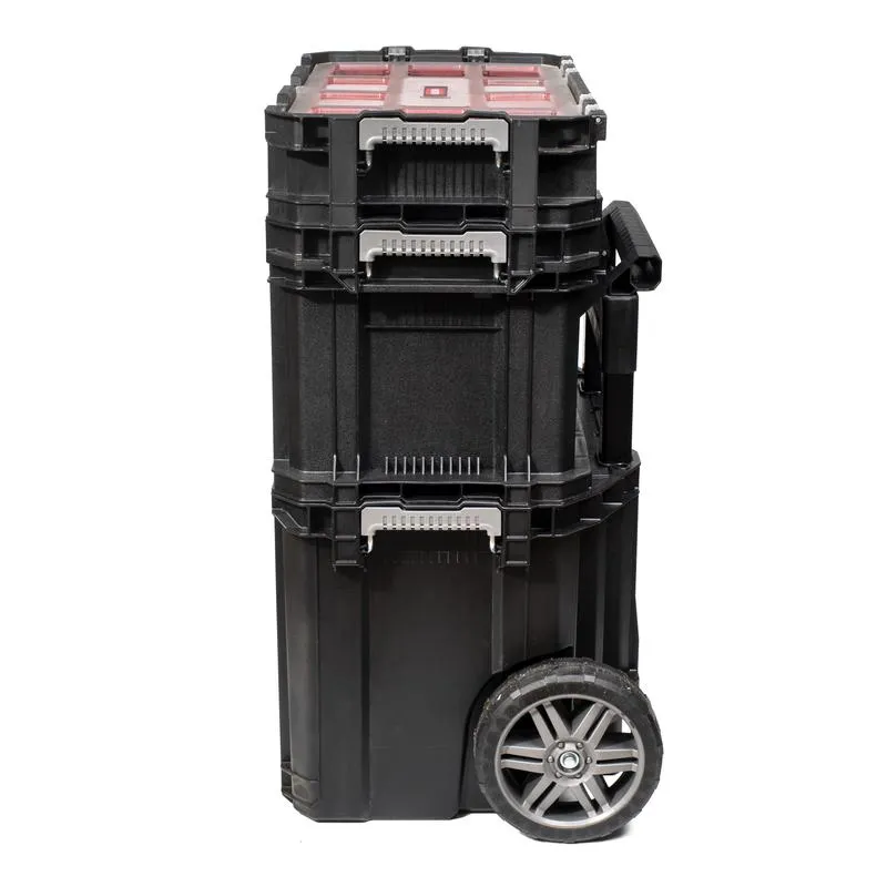 Модульная система из прочного полипропилена, состоящая из ящика-тележки с объемным отсеком, вместительного съемного ящика для габаритного инструмента и съемного органайзера для мелких деталей, фурнитуры, метизов