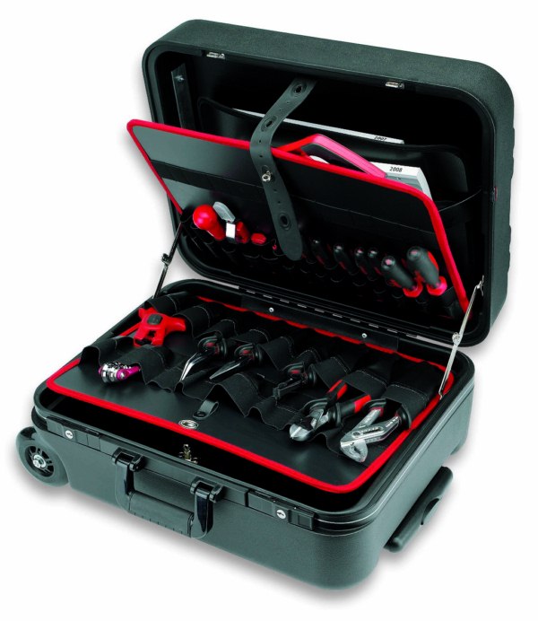 Набор профессионального инструмента для мастеров-электриков из 23 предметов в прочном полиэтиленовом кейсе MEGA-WHEEL с встроенными колесиками и телескопической рукояткой.