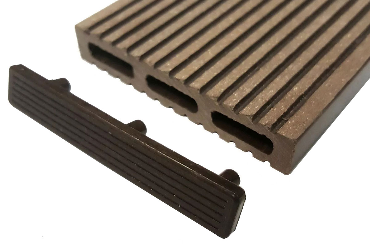 В большинстве случаев, для снижения цены настила, террасная доска из ДПК изготавливается пустотелая и для придания ей эстетичного вида используются либо торцевой профиль (уголок) , либо специальные пластиковые заглушки.