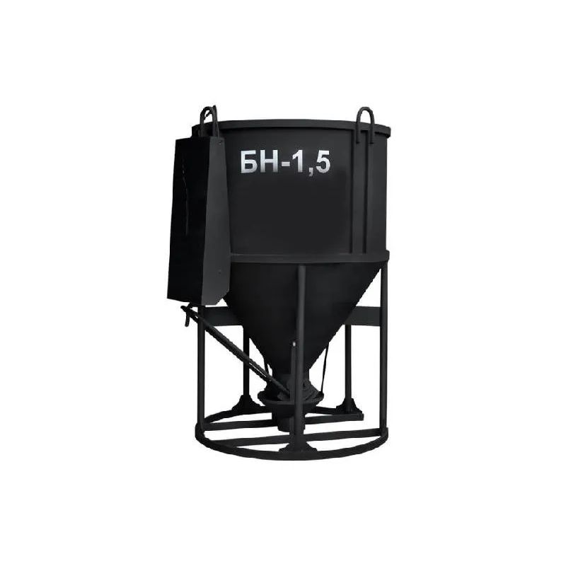 Конструктивные особенности предусматривают мощный металлический каркас, благодаря которому обеспечивается устойчивое положение емкости. Бадья для бетона БН-1.5 имеет вместительный объем в 1500 литров, что позволяет увеличить производительность труда и минимизировать затраты энергии при масштабных строительных работах.
