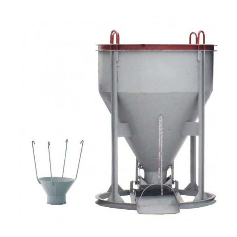 Бадья для бетона БНу-1.0 (воронка, лоток) — по форме напоминает (рюмку или колокол) емкостью 1000 литров, идеально подходит для выполнения работ по заливке бетонными смесями стен и перекрытий. Форма бадьи предотвращает зависание бетона на стенках.Шиберный затвор позволяет плавно заполнять конструкции.  Бадья оснащена выпуском для рукава (воронкой)  D=200 мм. В комплект бадьи входит лоток для выгрузки и хомут для воронки.
