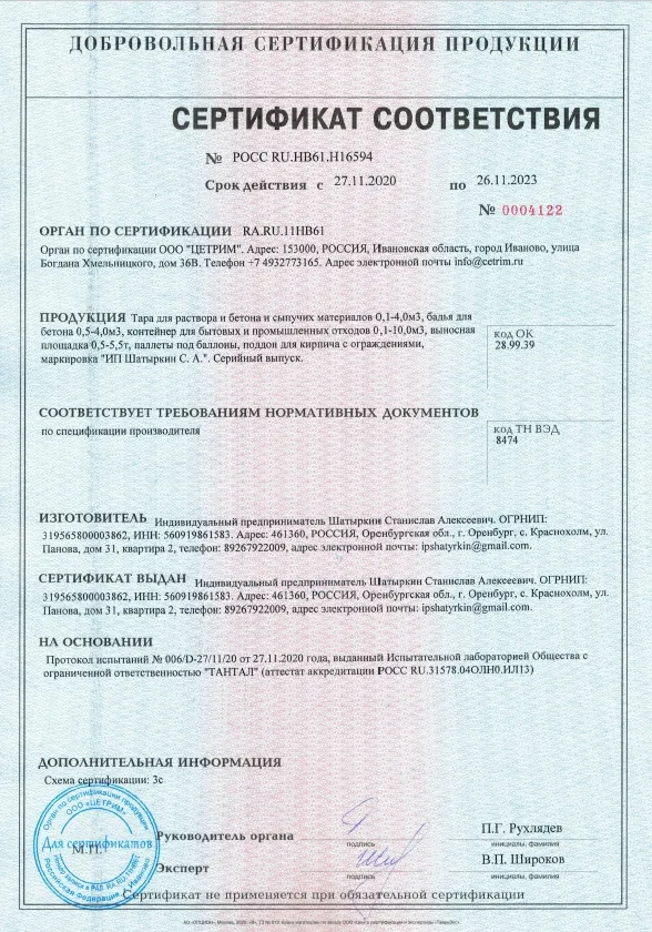 В число преимуществ модели входит шиберный раствор, за счет которого бетонный раствор плавно заполняет форму. В комплект поставки входит не только сама бадья, но также лоток для выгрузки и технический паспорт оборудования. Изделие соответствует требованиям государственных стандартов.