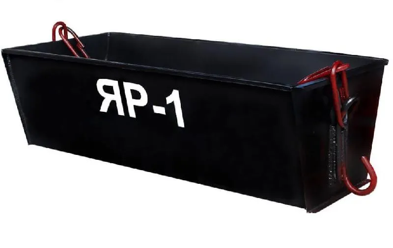 Тара для раствора предназначена для перемещения строительных сыпучих материалов и различных смесей, замеса растворов. ЯР-1 используется на крупных строительных объектах. В данной емкости транспортируют составы из песка и бетона. Модель представляет собой прочную сварную конструкцию в виде корыта из листовой стали высокой герметичности и усилена наваренными уголками, что исключает раскрытие короба в рабочем процессе. Вес составляет 53 кг.