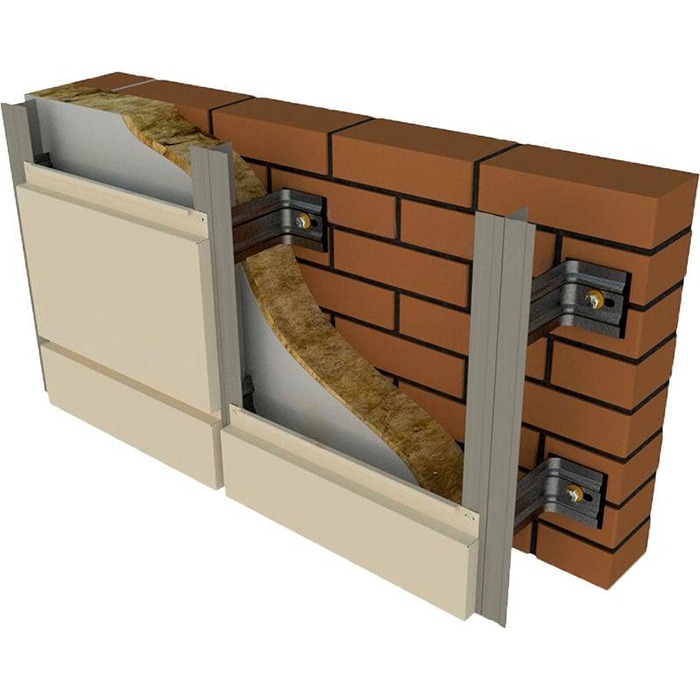 Для крепления металлических кассет применяется клепка или саморезы. Монтажные работы предусматривают выполнение разметки фасада с установкой кронштейнов. Благодаря анкерам происходит фиксация утеплителя. С помощью самосверлящих саморезов на кронштейны крепятся направляющие. Фасадная система фиксируется за счет самосверлящих саморезов в цвет с металлическими панелями.