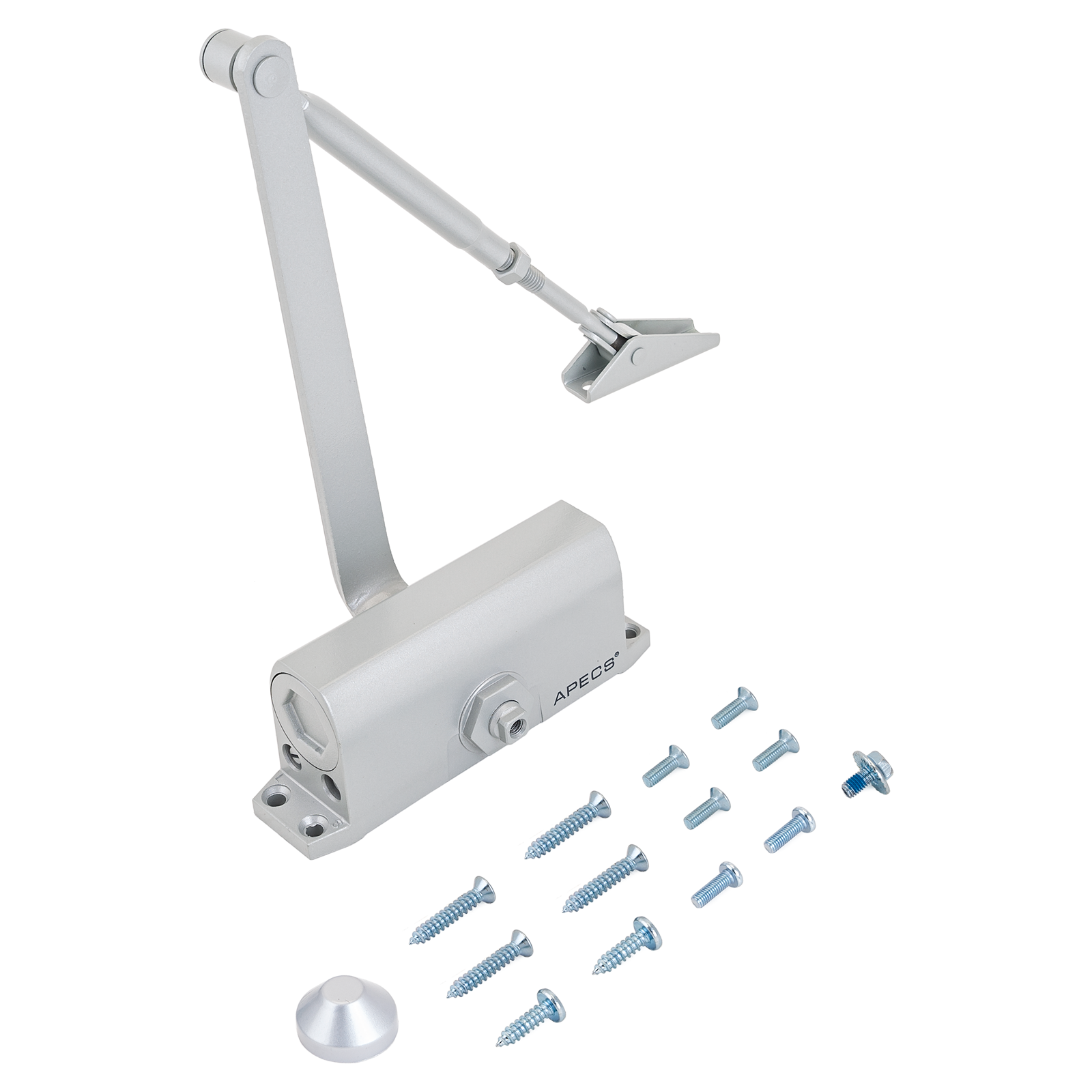 Доводчик дверной со складным рычагом. Предназначен для дверей весом 40-65 кг. Габариты корпуса — 146х36х57 мм. Две регулировки скорости. Допустимая температура эксплуатации от -40°С.