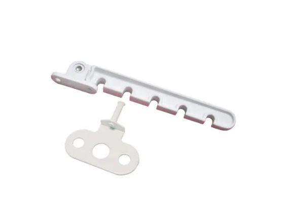 Ограничитель оконный предназначен для регулировки открытия пластикового окна или пластиковых дверей в 5 положениях. Имеет 5 отверстия в которую вставляется штырь. Ограничитель состоит из “гребенки” и “чебурашки” Гребенка сделана из алюминия, имеет 5 отверстия для фиксирования окна в режиме проветривания помещения. Чебурашка сделана из металла толщиной 1,5 мм. В нее вставлен штырь диаметром 5 мм. Этот штырь вставляется в отверстия гребенки. Отверстия сделаны так, чтобы штырь плотно фиксировался и не болтался, во избежание поломки пластикового ограничителя.