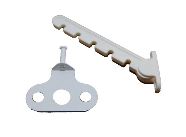Ограничитель оконный предназначен для регулировки открытия пластикового окна или пластиковых дверей в 5-ти положениях. Имеет 5 отверстия в которую вставляется штырь. Ограничитель состоит из “гребенки” и “чебурашки” Гребенка сделана из пластмассы, имеет 5 отверстий для фиксирования окна в режиме проветривания помещения. Чебурашка сделана из металла толщиной 1,5 мм. В нее вставлен штырь диаметром 5 мм. Этот штырь вставляется в отверстия гребенки. Отверстия сделаны так, чтобы штырь плотно фиксировался и не болтался во избежание поломки пластикового ограничителя.