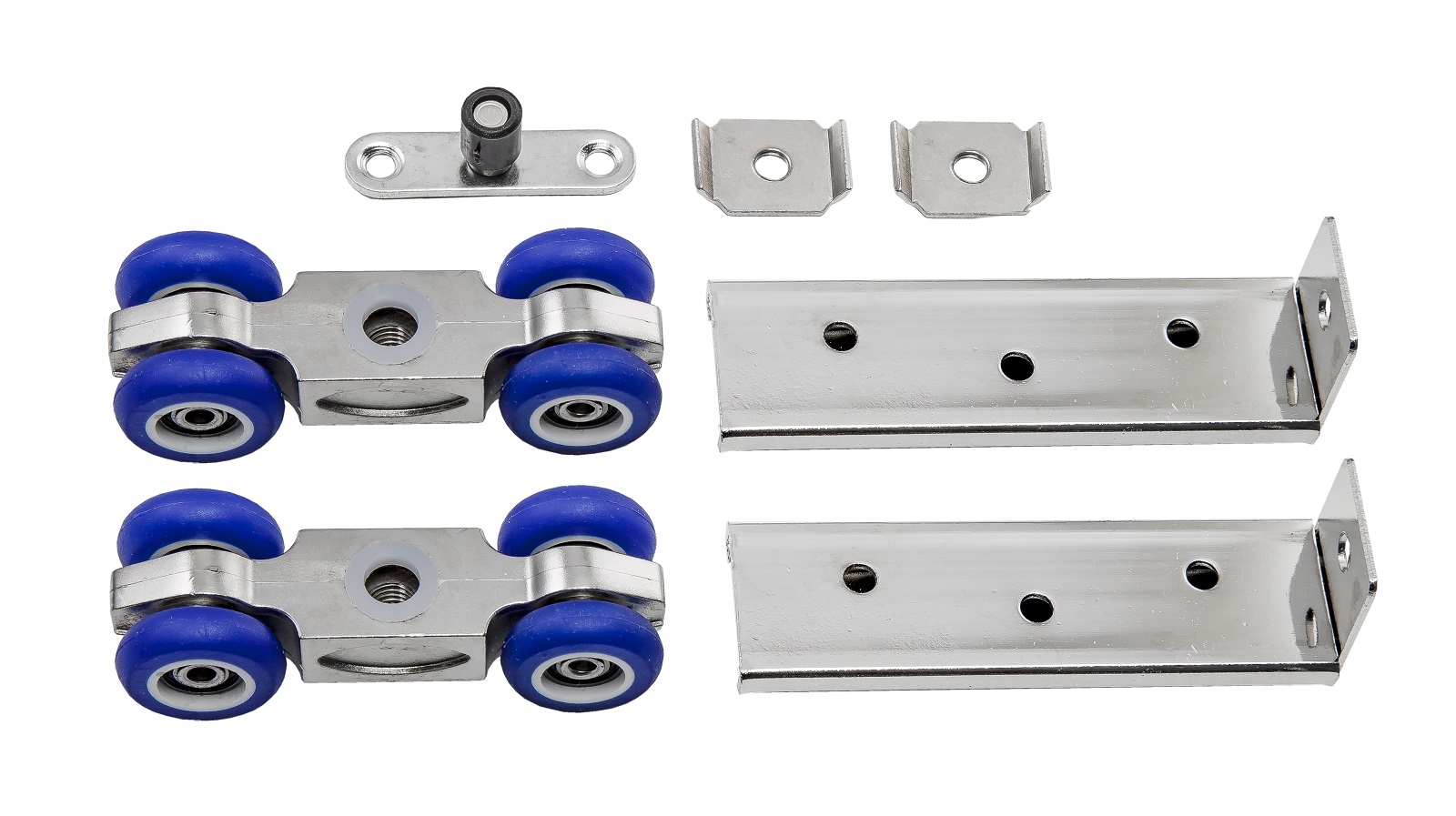 Комплект роликов для раздвижных дверей. Усиленный, без фиксатора. Бесшумная конструкция за счет полиуретанового покрытия роликов, шариковые подшипники, подходит для дверных полотен любой ширины, торцевое крепление, нижняя направляющая в виде ролика.