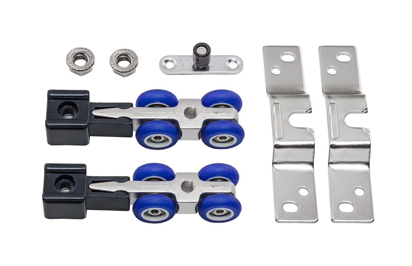 Комплект роликов для раздвижных дверей. Для легких дверей, с фиксатором. Бусшумная конструкция за счет полиуретанового покрытия роликов, шариковые подшипники, подходит для дверных полотен любой ширины, универсальное крепление, наличие фиксатора в открытом и закрытом положении, нижняя направляющая в виде ролика.