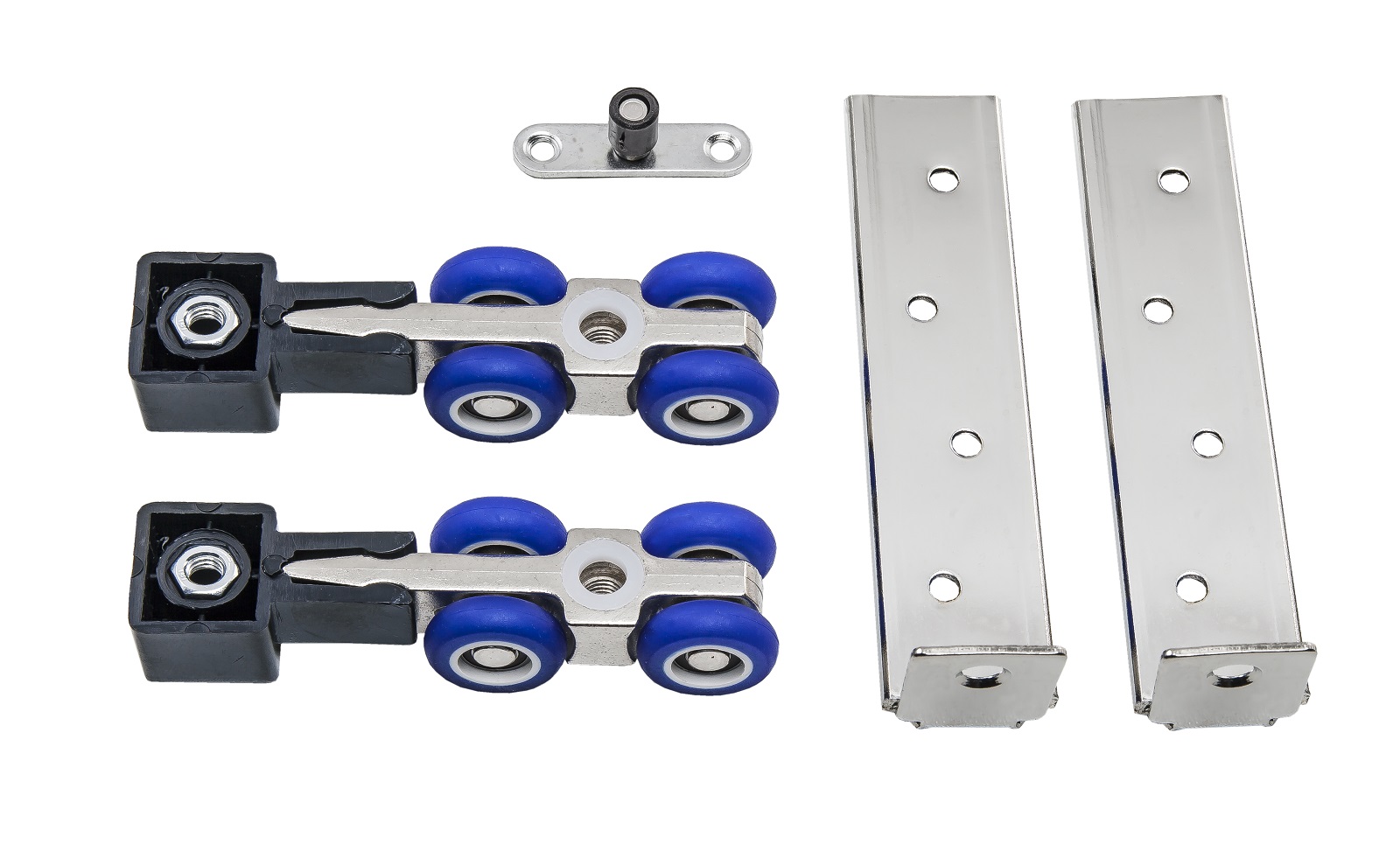 Комплект роликов для раздвижных дверей. Усиленный, с фиксатором. Бесшумная конструкция за счет полиуретанового покрытия роликов, шариковые подшипники, подходит для дверных полотен любой ширины, торцевое крепление, наличие фиксатора в открытом и закрытом положении, нижняя направляющая в виде ролика.