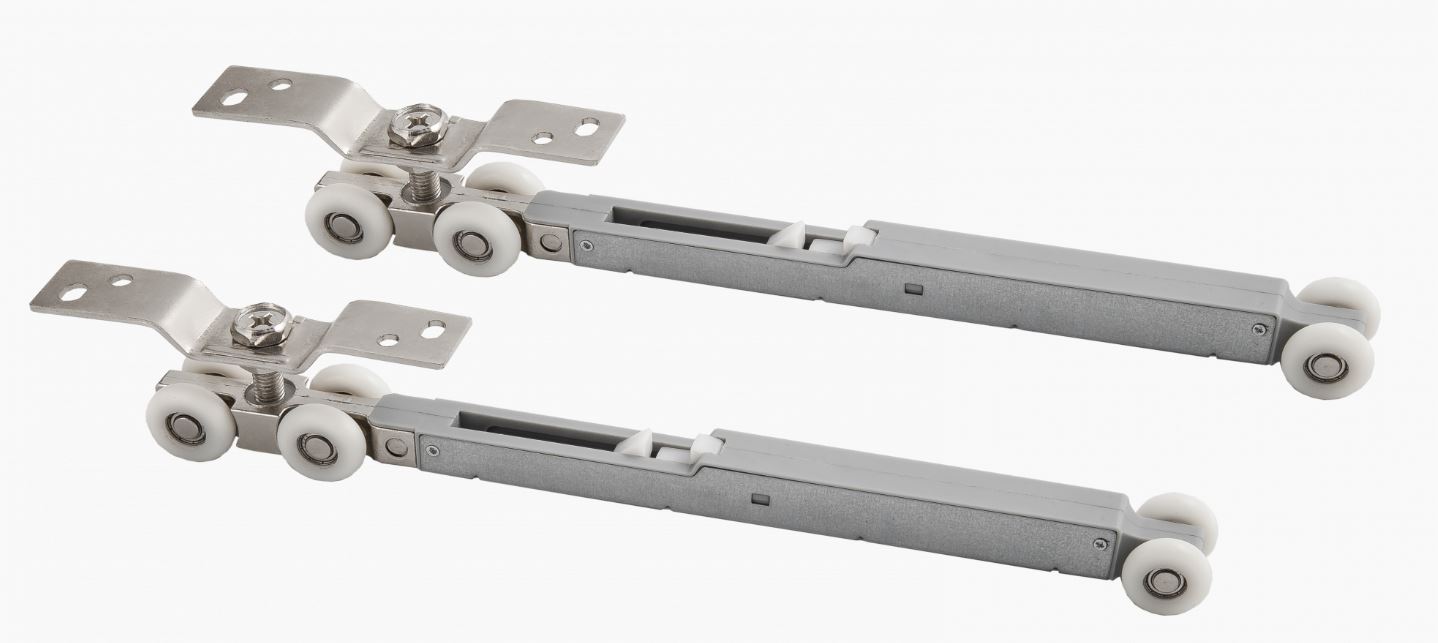 Крепежные планки крепятся от угла дверного полотна. Модель имеет фиксатор, который смягчает удар ролика и фиксирует его при крайнем открытом или закрытом положении двери.