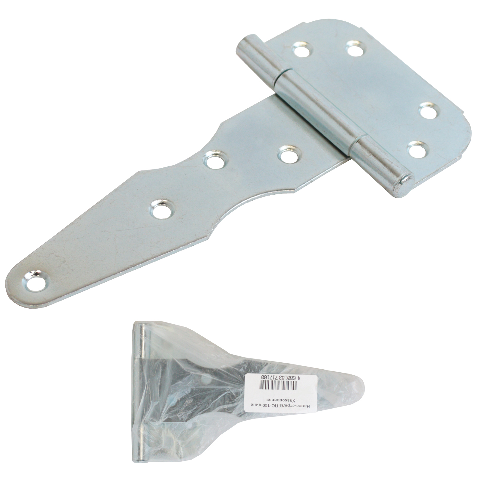Петля-стрела для навесных ворот, дверей. Материал — сталь. Габариты крепежной части- 90х50х2 мм, длина «стрелы» — 130 мм, 4 отверстия для крепления.