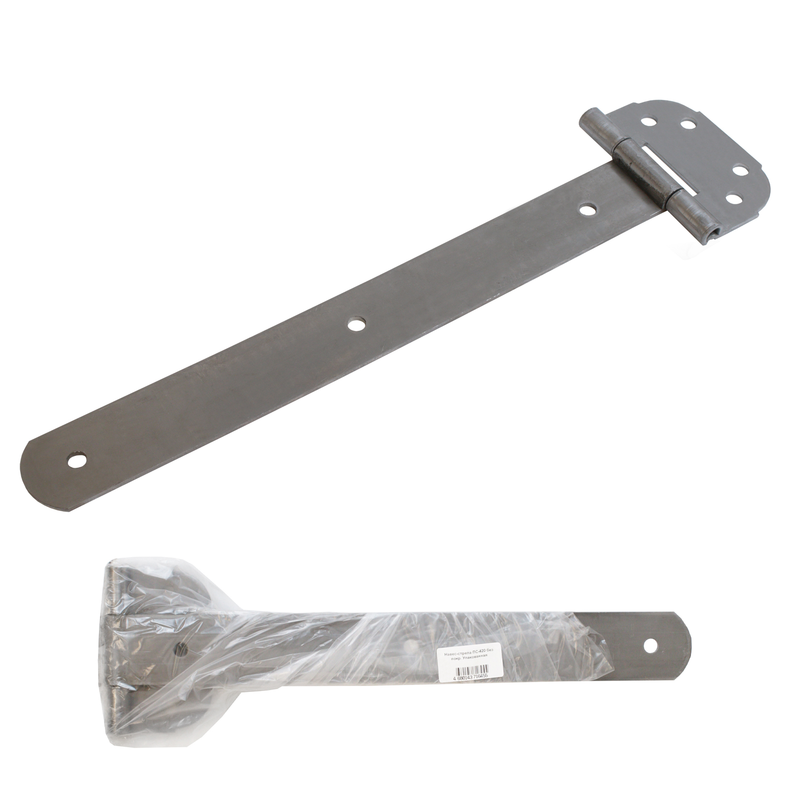 Петля-стрела для навесных ворот, дверей. Материал — сталь. Габариты крепежной части — 130х80х5 мм, длина «стрелы» — 420 мм.