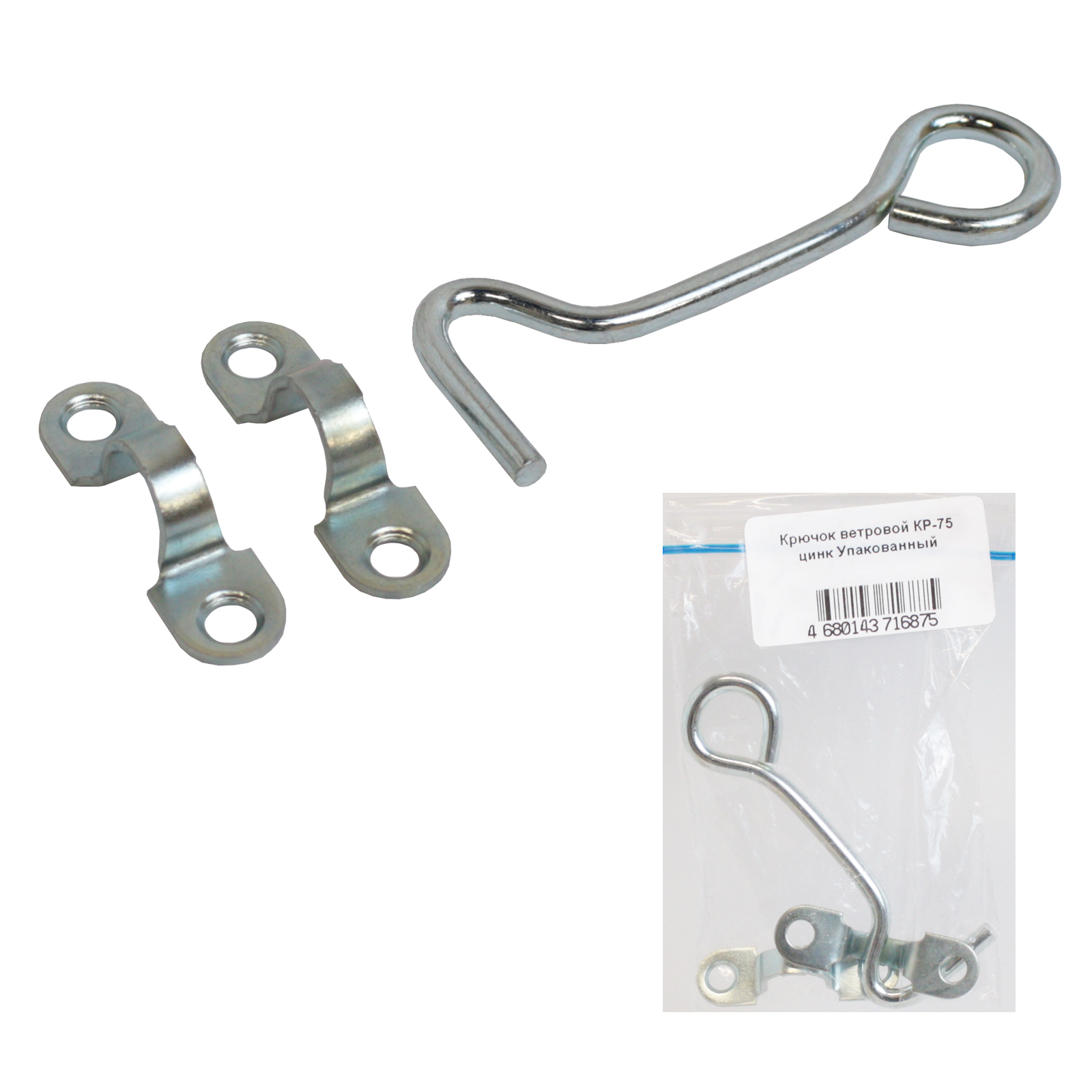 Крючок ветровой прутиковый на планках. Материал — цинкованная сталь. Длина — 75 мм. В комплект входит ответная планка.