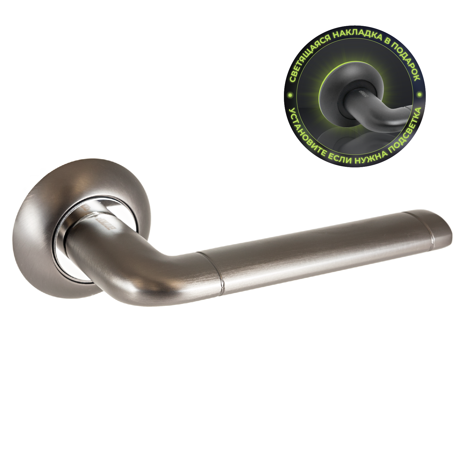Комплект ручек, подпружиненный на круглой накладке для деревянных и легких металлических дверей с толщиной полотна 34-45 мм. Материал ручек — алюминиевый сплав с многослойным гальваническим покрытием. Комплектуются винтовыми стяжками, шурупами, квадратным стержнем в сечении 8х8 мм. Отличительная особенность — в комплекте идут пластиковые накладки с люминофором, которые светятся в темноте.