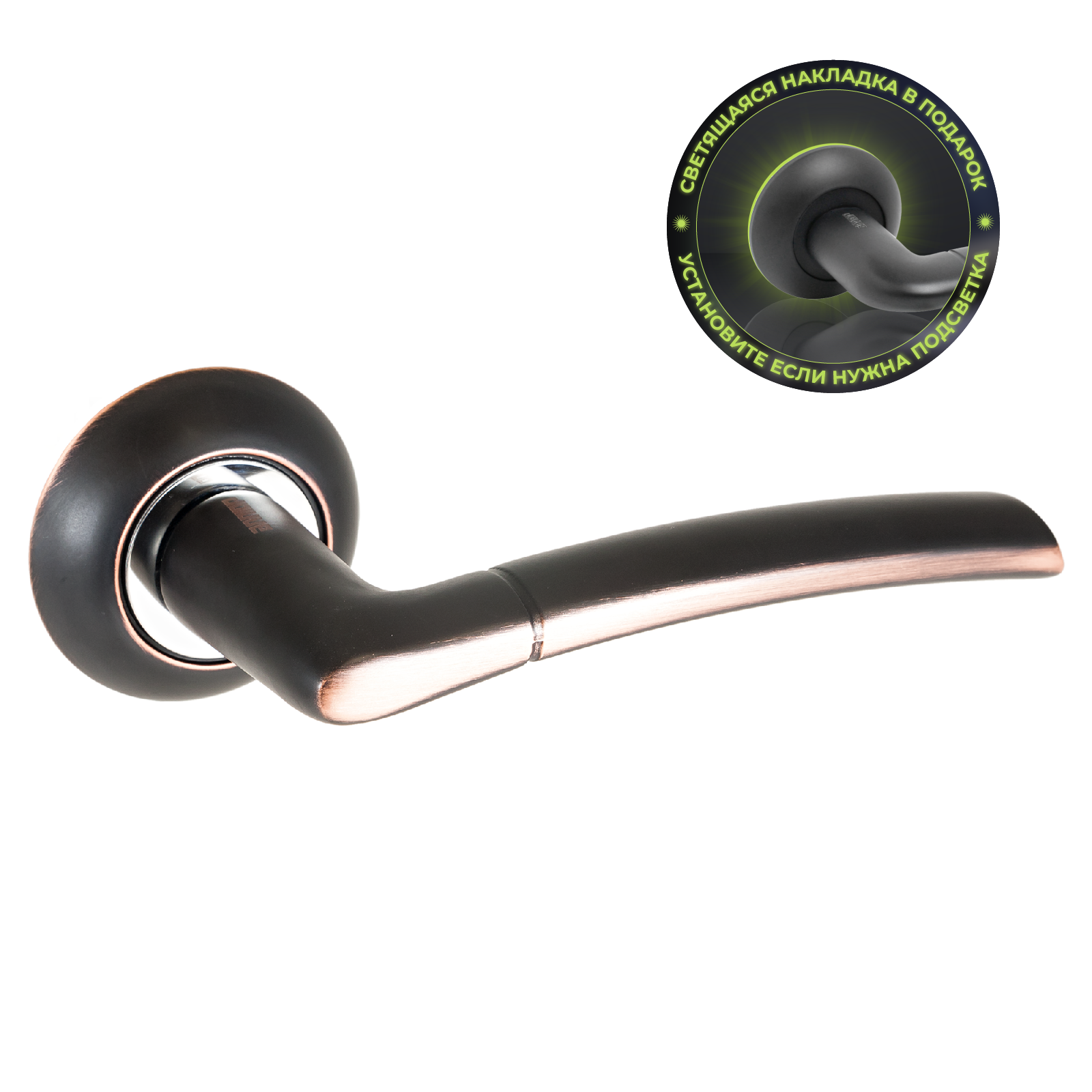 Комплект ручек, подпружиненный на круглой накладке для деревянных и легких металлических дверей с толщиной полотна 34-45 мм. Материал ручек — алюминиевый сплав с многослойным гальваническим покрытием. Комплектуются винтовыми стяжками, шурупами, квадратным стержнем в сечении 8х8 мм. Отличительная особенность — в комплекте идут пластиковые накладки с люминофором, которые светятся в темноте.