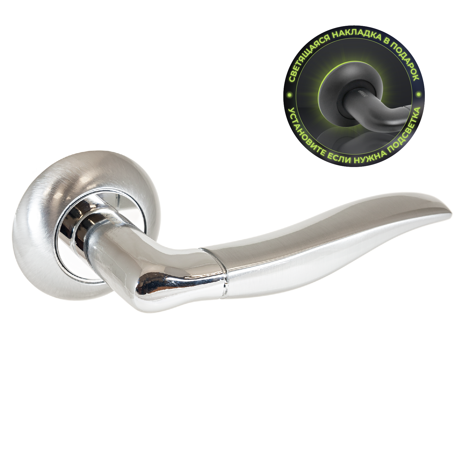 Комплект ручек, подпружиненный на круглой накладке для деревянных и легких металлических дверей с толщиной полотна 34-45 мм. Материал ручек — алюминиевый сплав с многослойным гальваническим покрытием. Комплектуются винтовыми стяжками, шурупами, квадратным стержнем в сечении 8х8 мм. Отличительная особенность — в комплекте идут пластиковые накладки с люминофором, которые светятся в темноте.