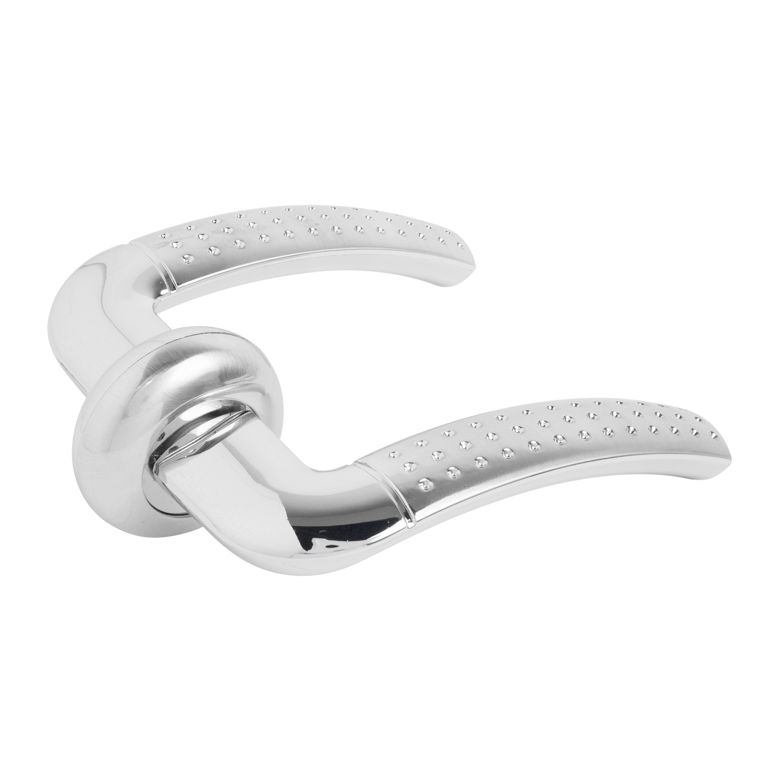 Комплект ручек, подпружиненный на круглой накладке для деревянных и легких металлических дверей с толщиной полотна 70-80 мм. Материал ручек — ABS пластик с гальваническим покрытием, накладки — алюминиевый сплав. Комплектуются винтовыми стяжками, шурупами, квадратным стержнем в сечении 8х8 мм.