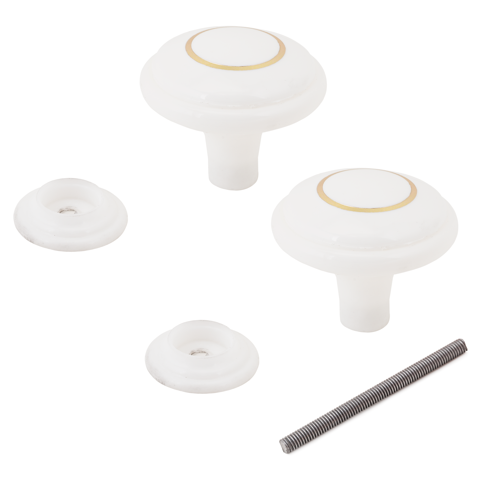 Ручка-кнопка дверная. Материал — пластик. Диаметр ручки — 65 мм, высота ручки — 65 мм. В комплекте соединительный штырь-винт длиной 100 мм. В центре ручки окантовка в виде золотого кольца.