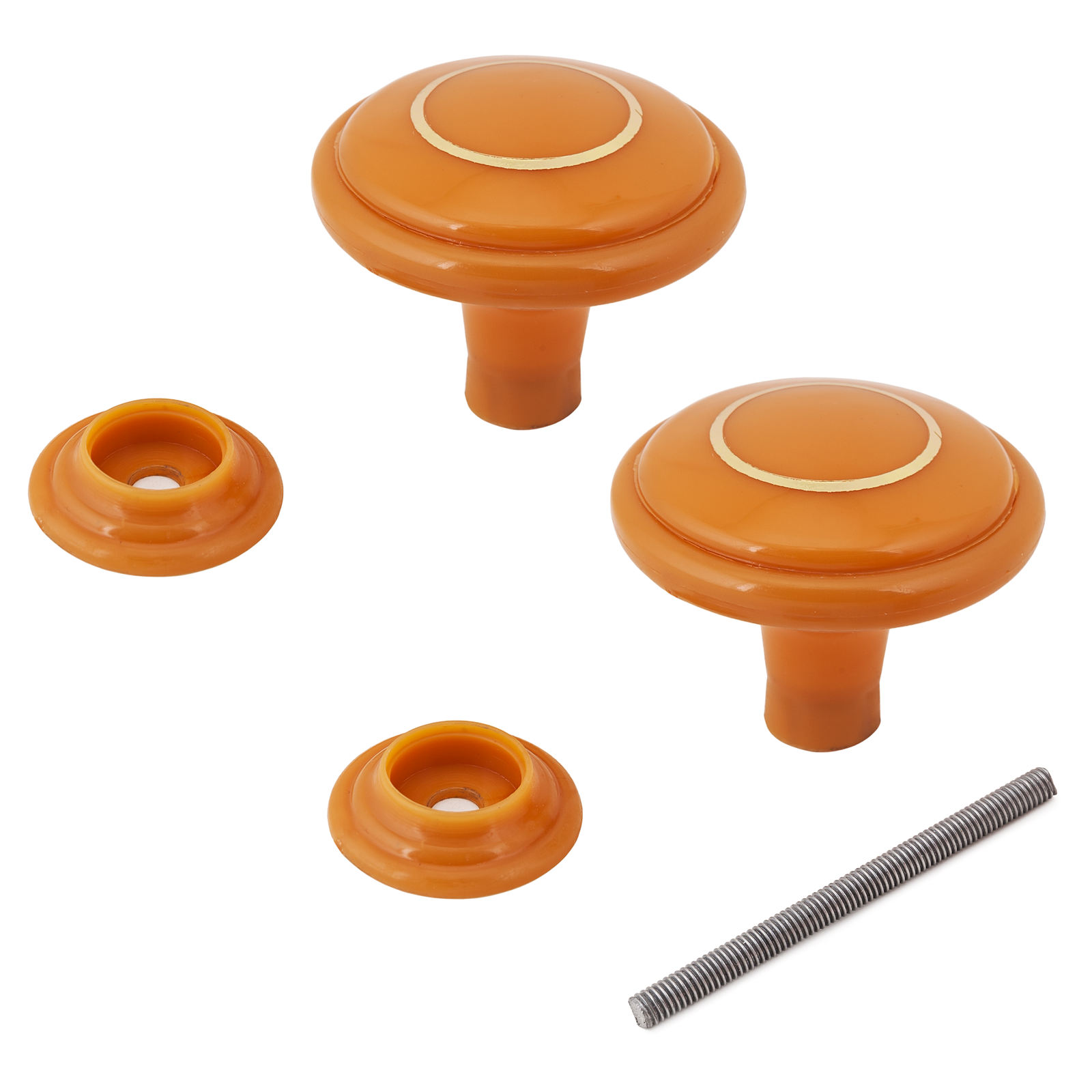 Ручка-кнопка дверная. Материал — пластик. Диаметр ручки — 65 мм, высота ручки — 65 мм. В комплекте соединительный штырь-винт длиной 100 мм. В центре ручки окантовка в виде золотого кольца.