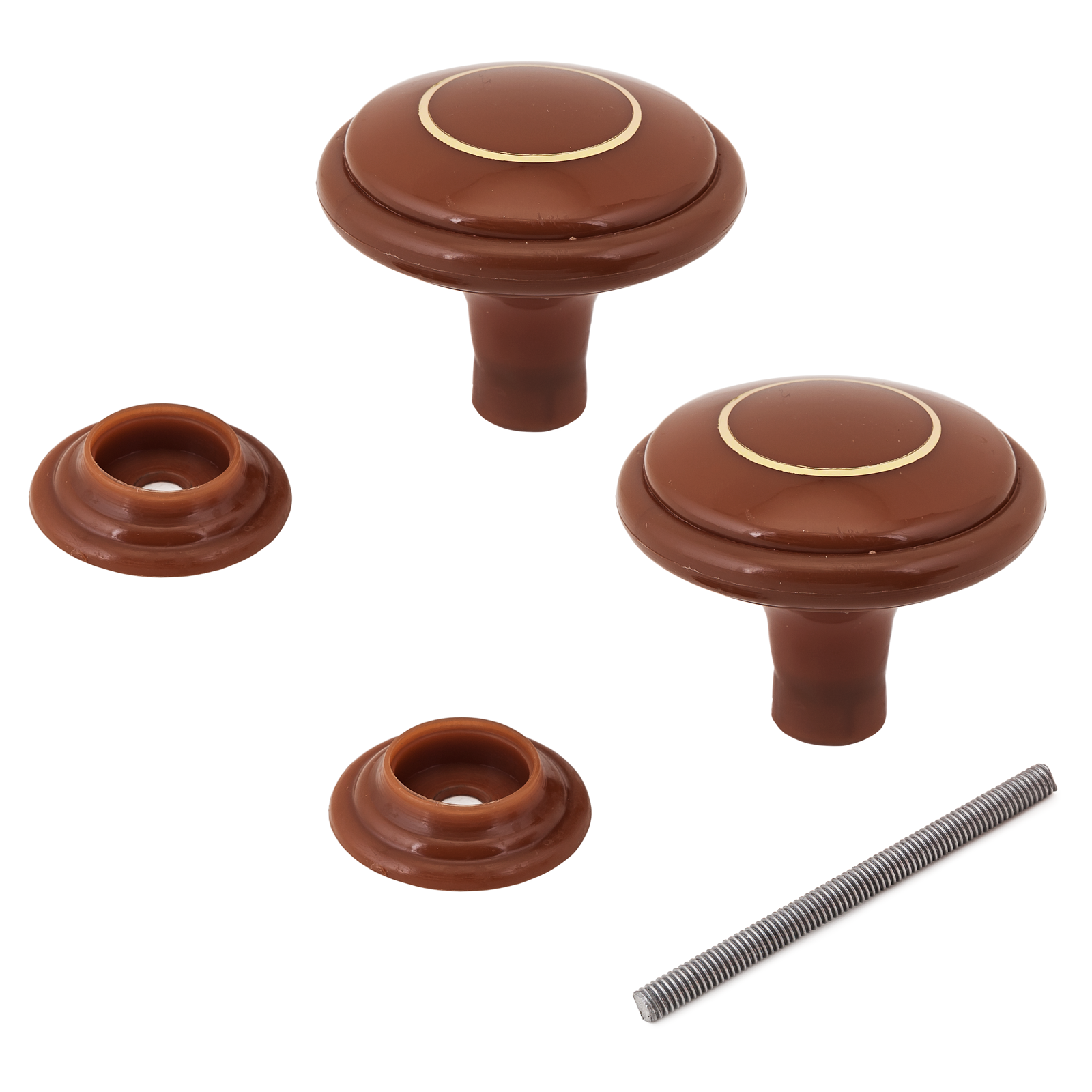 Ручка-кнопка дверная. Материал — пластик. Диаметр ручки — 65 мм, высота ручки — 65 мм. В комплекте соединительный штырь-винт длиной 100 мм. В центре ручки окантовка в виде золотого кольца.