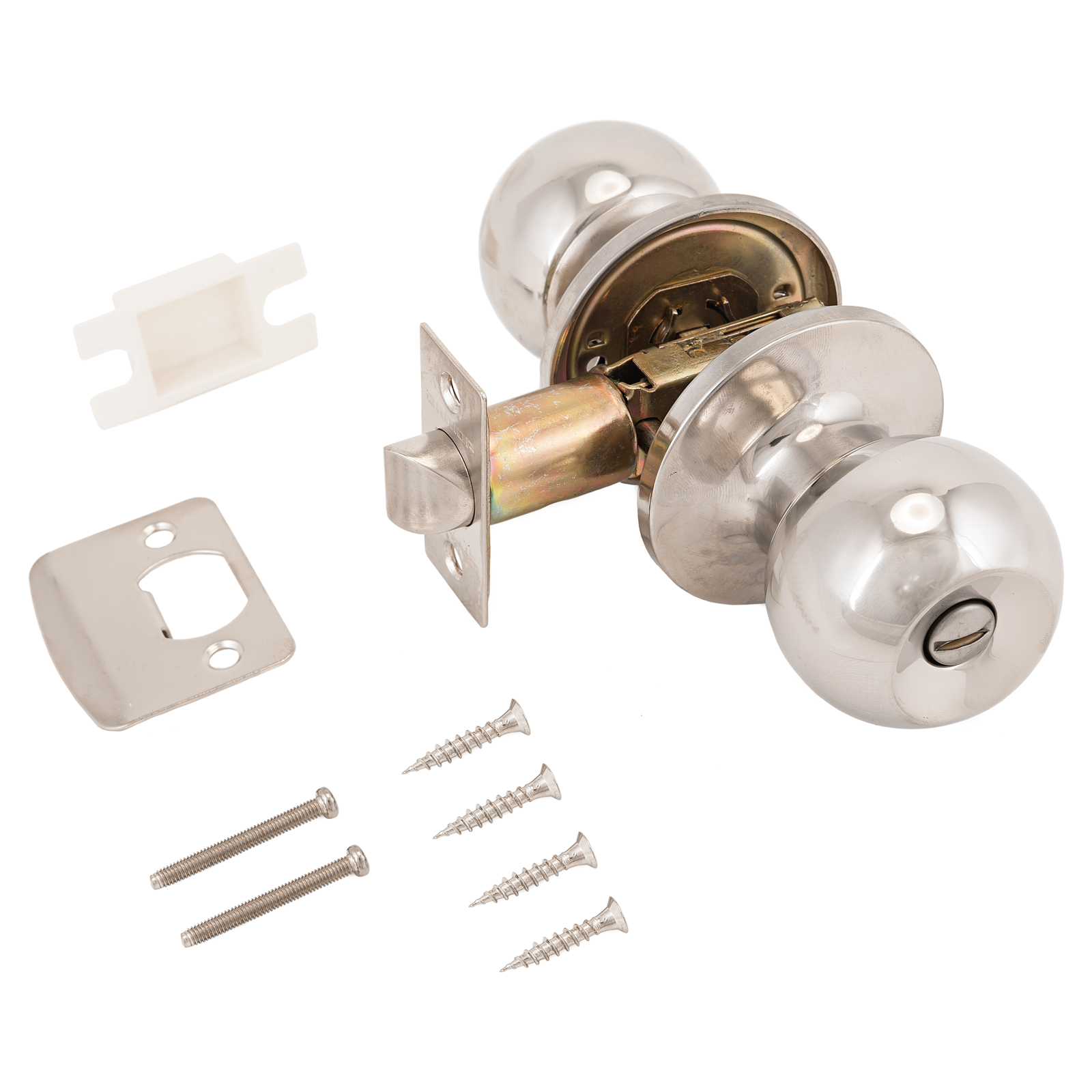 Ручка-защелка для межкомнатных дверей типа – кноб. Круглой формы, выполнена из полированной нержавеющей стали.