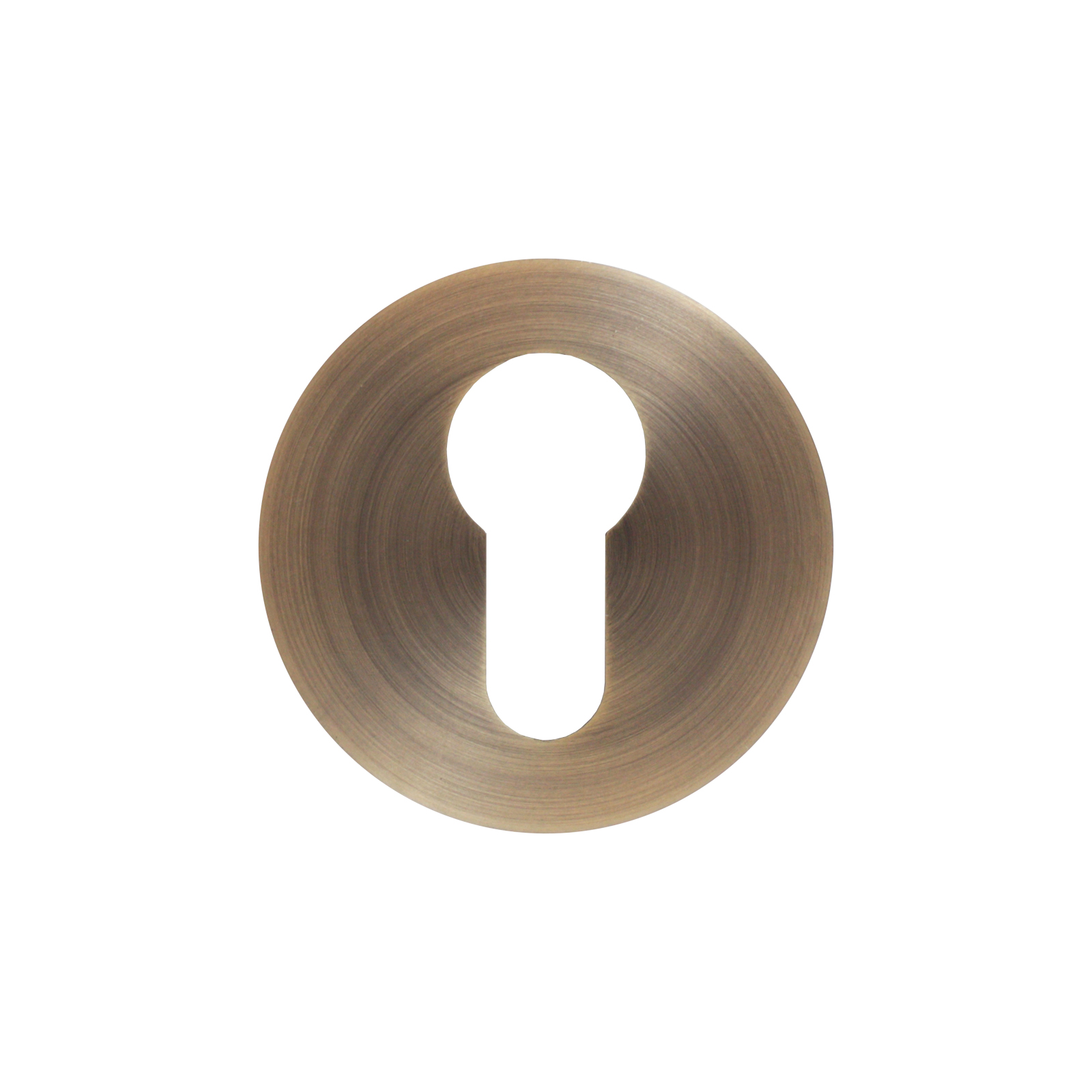 Комплект круглых декоративных накладок на тонком основании под цилиндровый механизм замка. Материал – алюминиевый сплав с гальваническим покрытием. Комплектуются шурупами.