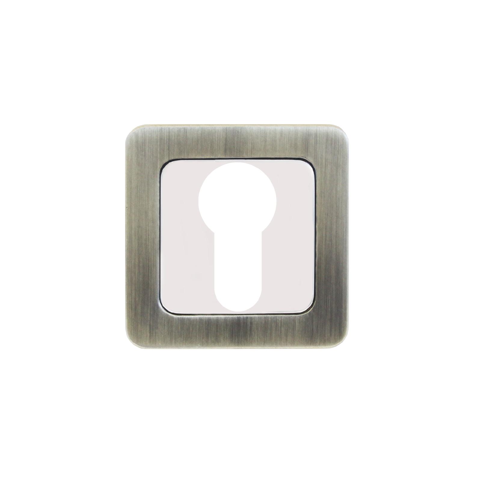 Комплект квадратных декоративных накладок под цилиндровый механизм замка. Материал – алюминиевый сплав с гальваническим покрытием. Комплектуются шурупами.