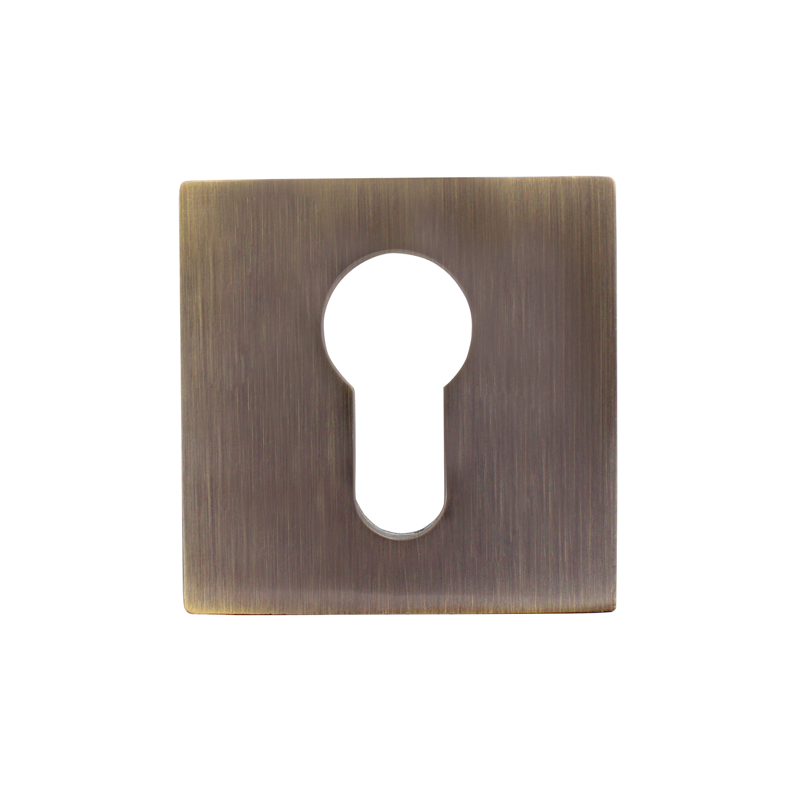 Комплект квадратных декоративных накладок на тонком основании под цилиндровый механизм замка. Материал – алюминиевый сплав с гальваническим покрытием. Комплектуются шурупами.