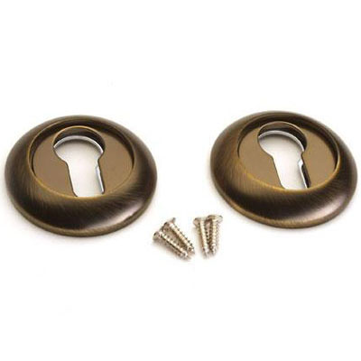 Комплект из 2-х накладок для цилиндрового механизма. Материал — ЦАМ, гальваническое покрытие. Круглая форма, диаметр 54 мм, толщина 12 мм. В комплекте — 2 накладки, 4 крепежных шурупа М4х15 мм. Накладка состоит из двух частей: 1) накладка с отверстиями под саморезы и резьбой на торце, 2) ободок с резьбой, который накручивается на накладку, закрывая отверстия под саморезы.