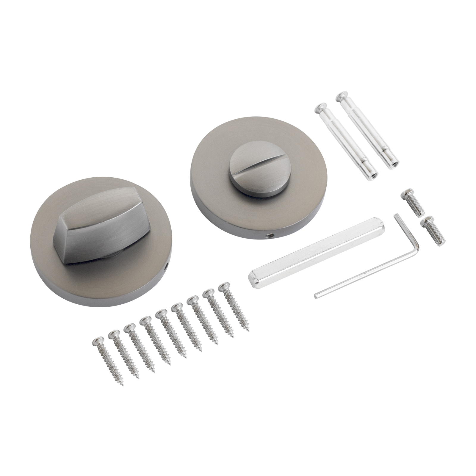 Комплект сантехнической завертки-фиксатора, на тонкой круглой накладке, для защелок, замков, задвижек. Материал — алюминиевый сплав с гальваническим покрытием. Комплектуются винтовыми стяжками, шурупами, квадратным стержнем в сечении 6х6 мм и длиной 55 мм.