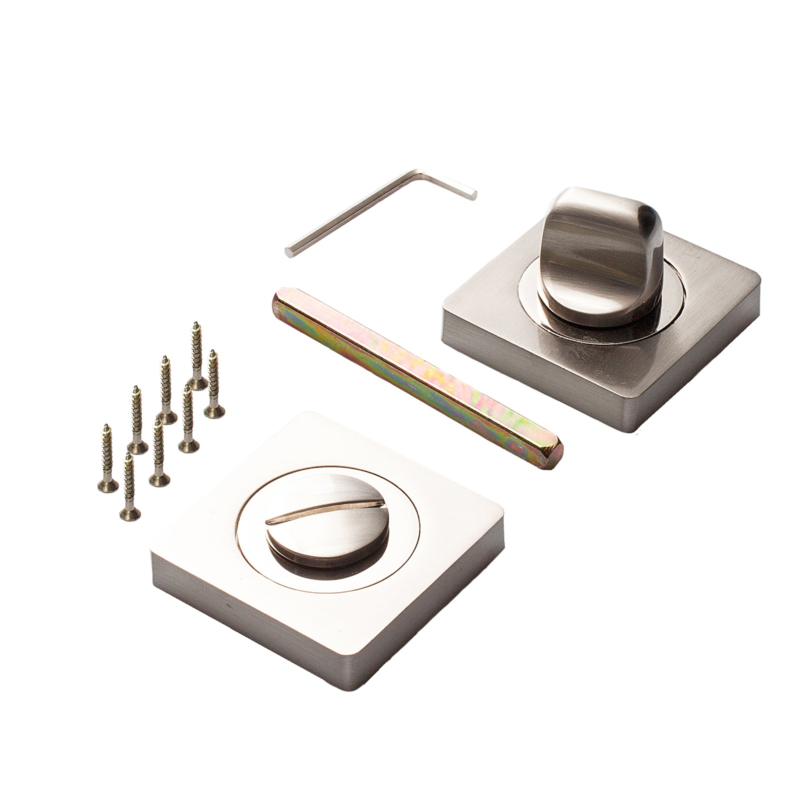 Сантехническая завертка-фиксатор для защелок, замков, задвижек. Размер сечения квадрата — 6 мм, длина — 75 мм. Накладка квадратной формы размерами 53х53х10 мм. Крепеж в комплекте.