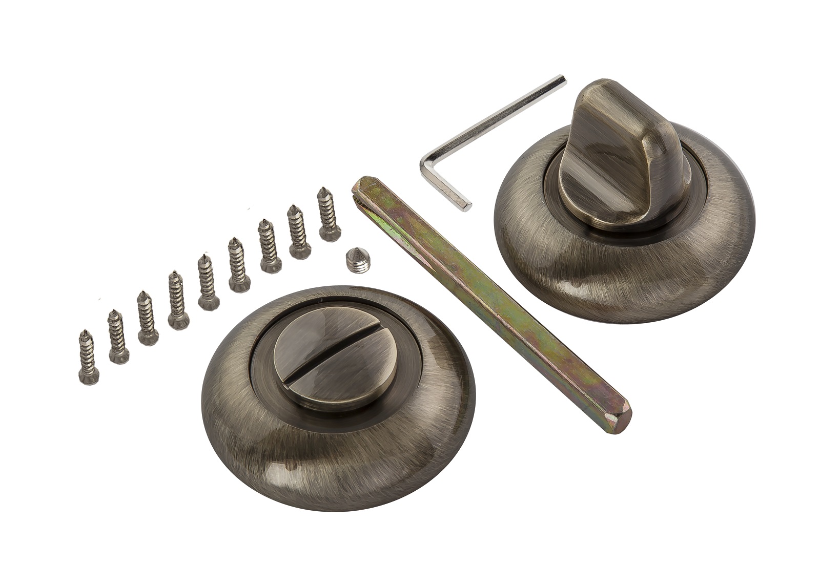 Сантехническая завертка-фиксатор для защелок, замков, задвижек. Размер сечения квадрата — 6 мм, длина — 75 мм. Накладка круглой формы диаметром 50 мм, толщиной 10 мм. Крепеж в комплекте.