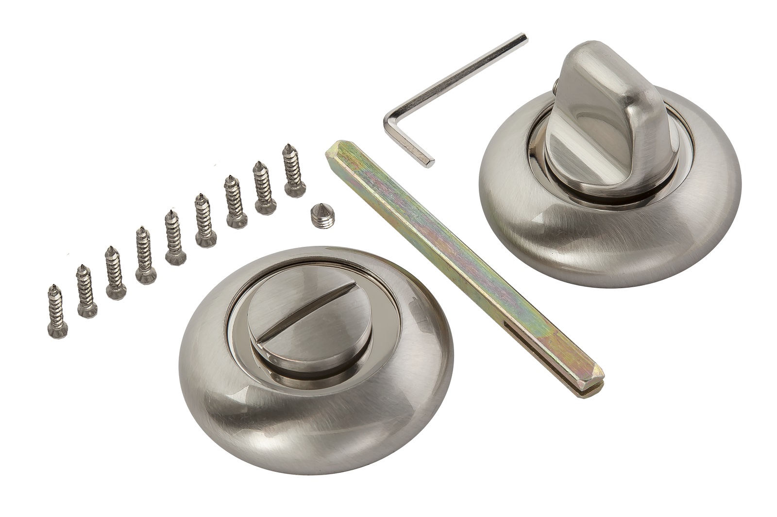 Сантехническая завертка-фиксатор для защелок, замков, задвижек. Размер сечения квадрата — 6 мм, длина — 75 мм. Накладка круглой формы диаметром 50 мм, толщиной 10 мм. Крепеж в комплекте.
