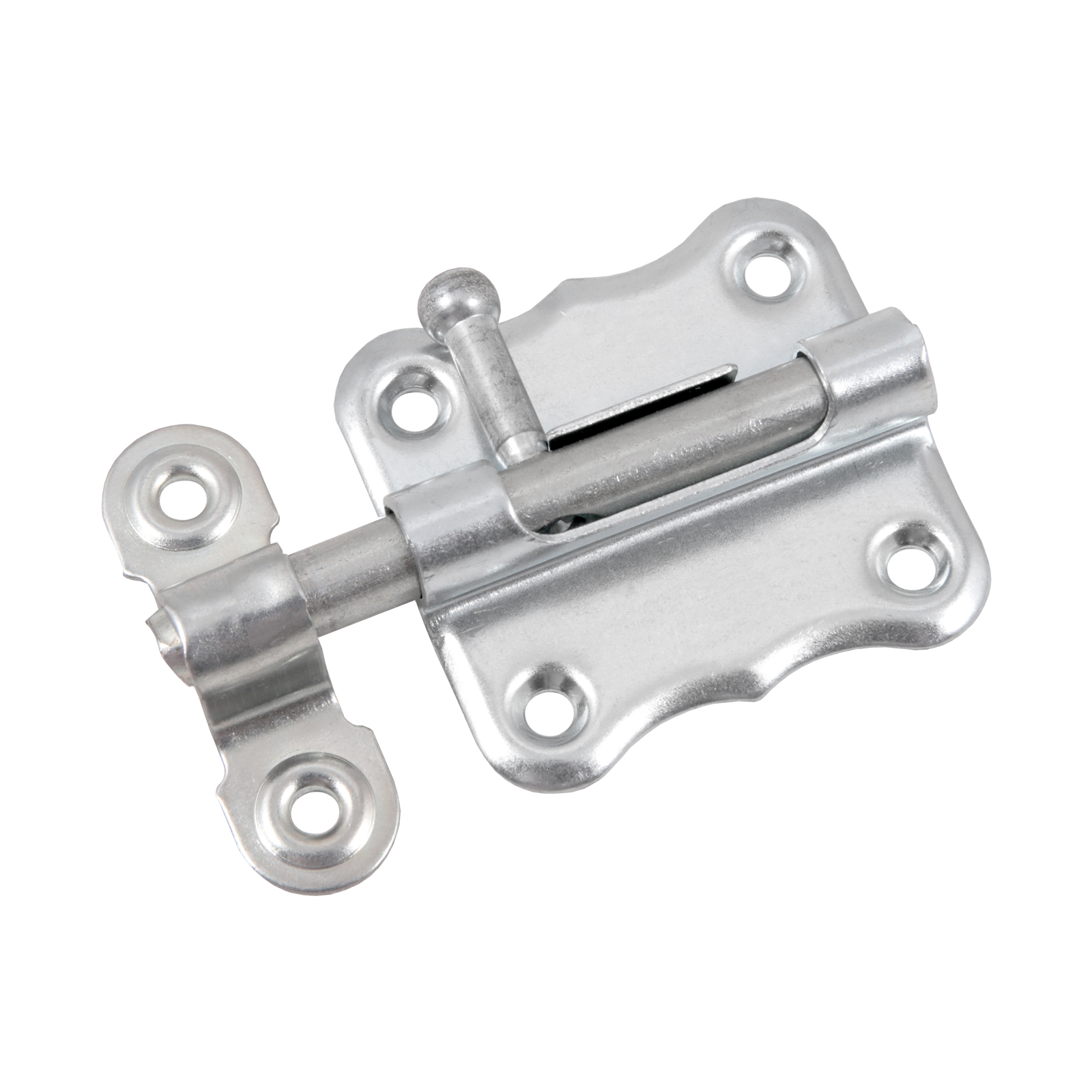 Шпингалет накладной для деревянных дверей. Материал — сталь. Габариты корпуса — 50х48 мм. Полый стержень с вылетом 25 мм. В комплект входит ответная планка.