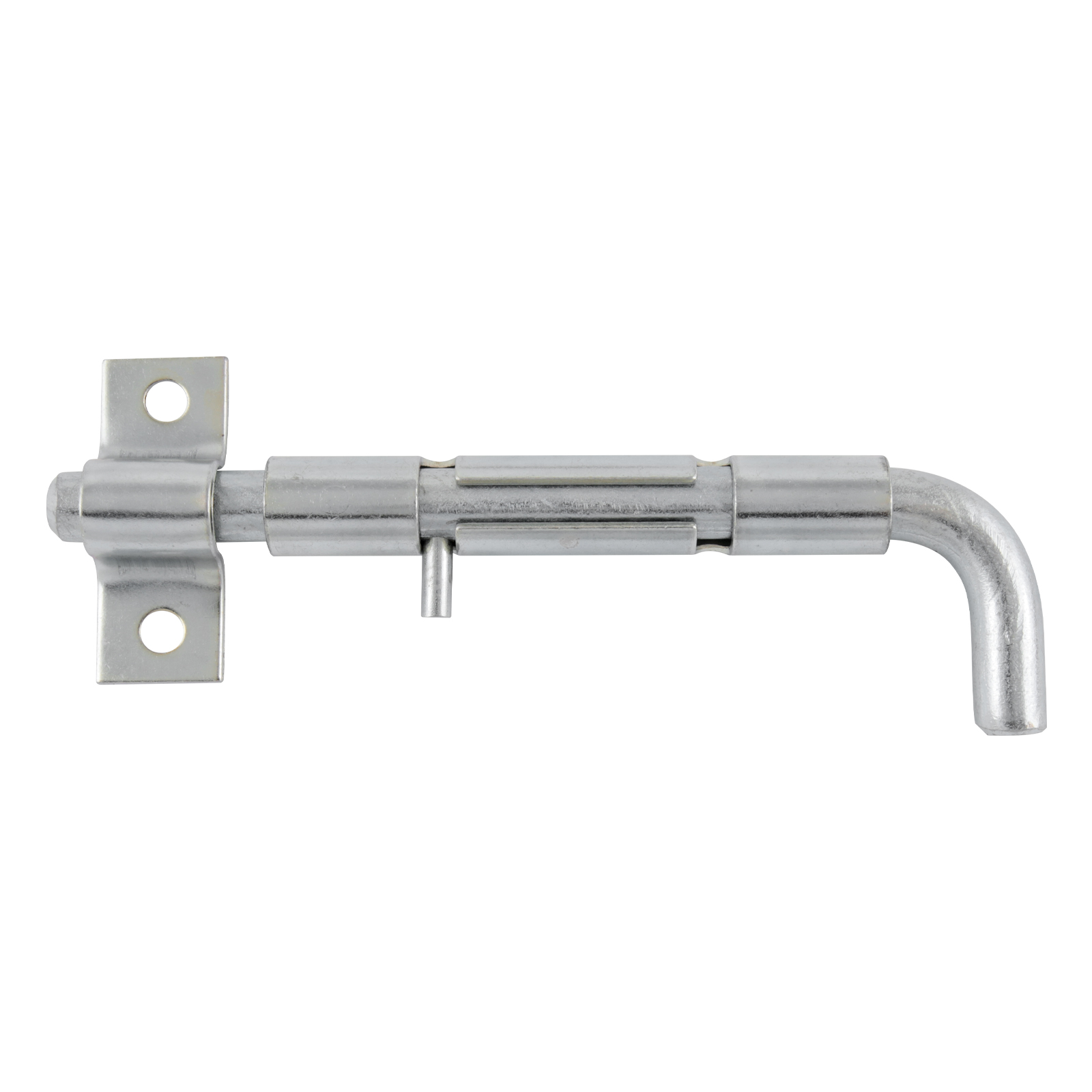 Засов под сварку для металлических дверей. Материал — сталь, полимерное покрытие. Габариты корпуса — диаметр 20 мм, длина 120 мм. Г-образный цилиндрический ригель диаметром 13 мм с вылетом 50 мм. В комплекте ответная планка 65х25 мм.