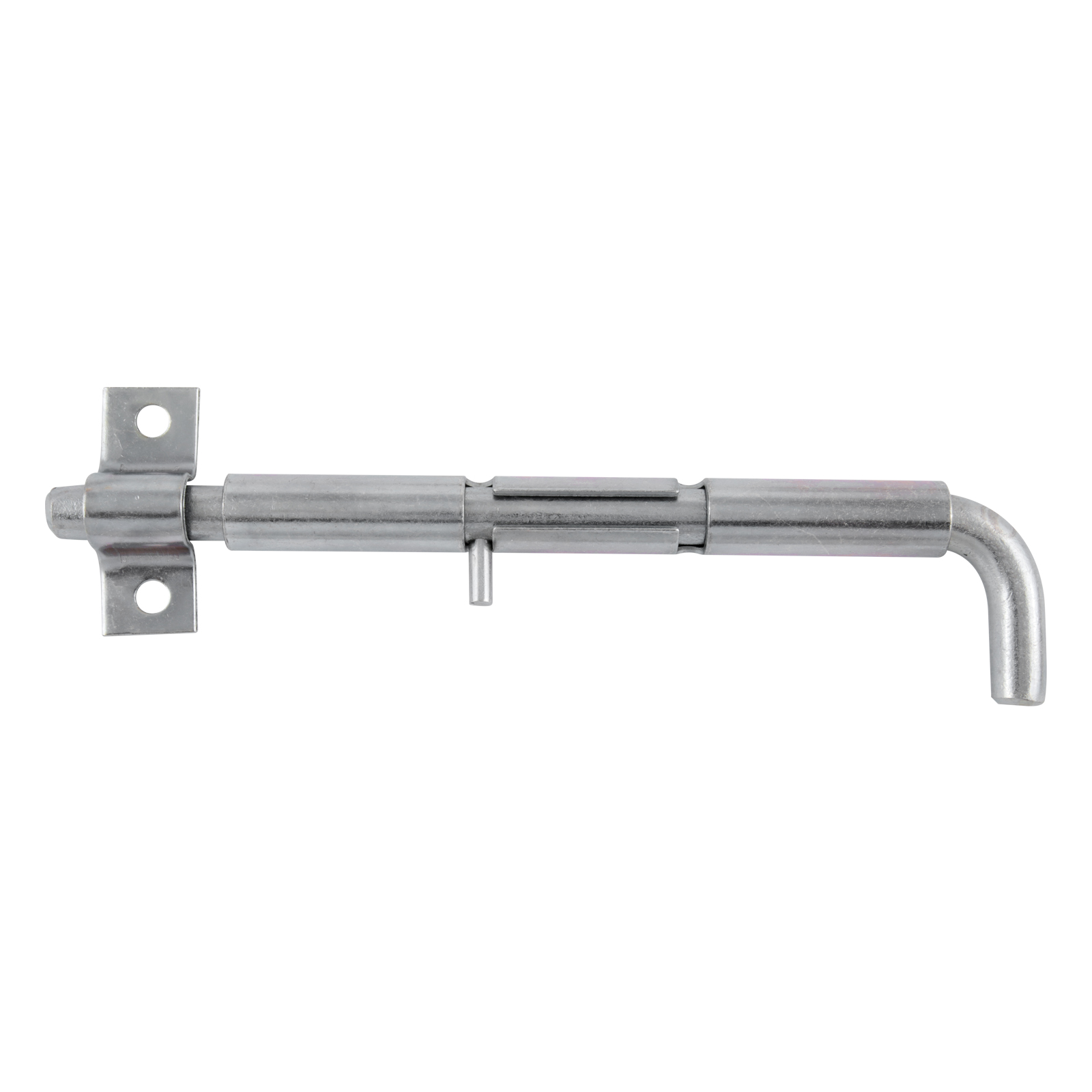 Засов под сварку для металлических дверей. Материал — сталь, полимерное покрытие. Габариты корпуса — диаметр 20 мм, длина 180 мм. Г-образный цилиндрический ригель диаметром 13 мм с вылетом 50 мм. В комплекте ответная планка 65х25 мм.