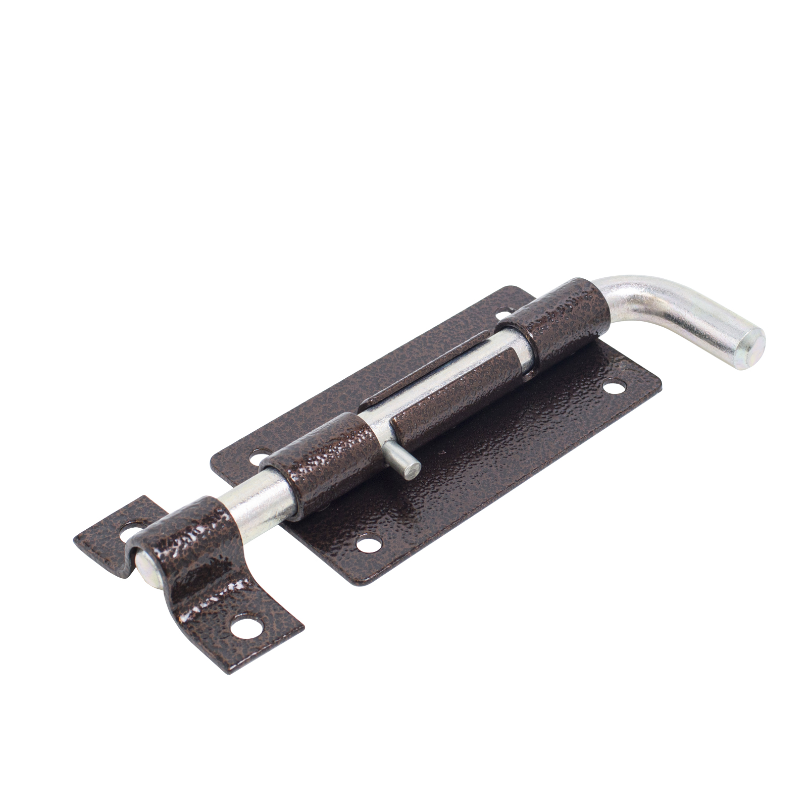 Засов накладной для металлических дверей. Материал — сталь, полимерное покрытие. Габариты корпуса — 65х120 мм, 4 крепежных отверстия. Г-образный цилиндрический ригель диаметром 13 мм с вылетом 55 мм. В комплекте ответная планка 65х25 мм.