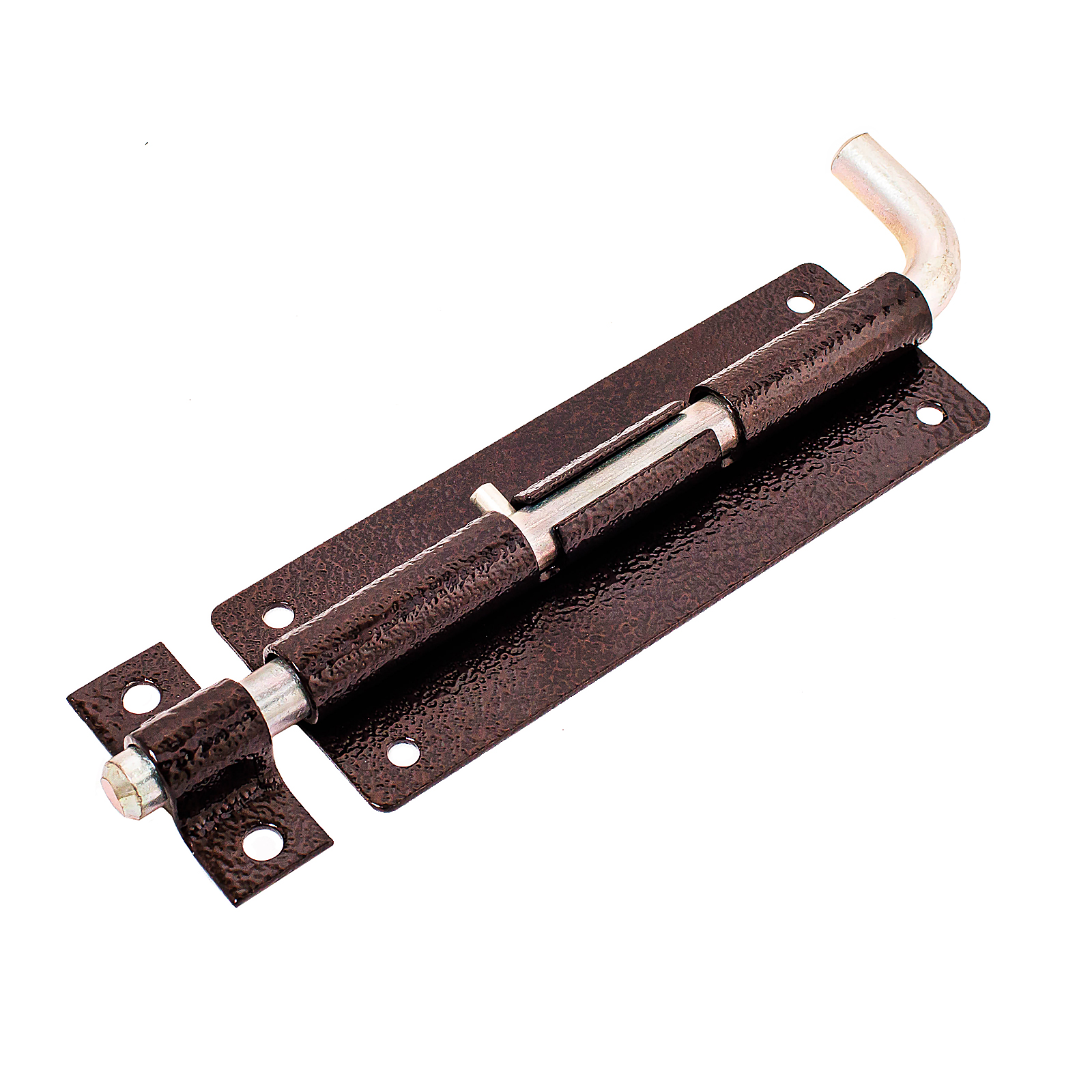 Засов накладной для металлических дверей. Материал — сталь, полимерное покрытие. Габариты корпуса — 65х180 мм, 4 крепежных отверстия. Г-образный цилиндрический ригель диаметром 13 мм с вылетом 55 мм. В комплекте ответная планка 65х25 мм.
