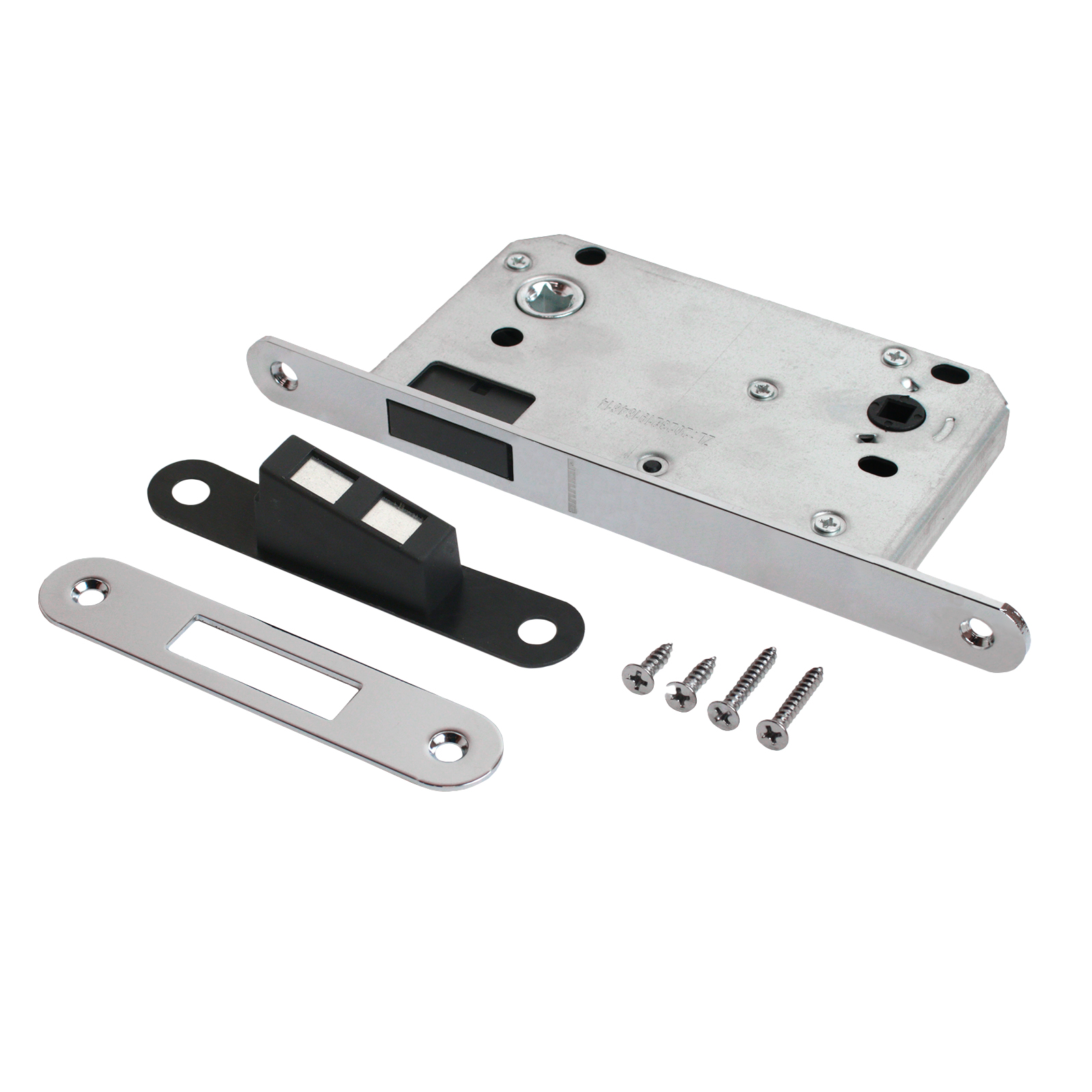 Универсальная магнитная врезная защелка со смещенным ригелем для установки на деревянные двери.