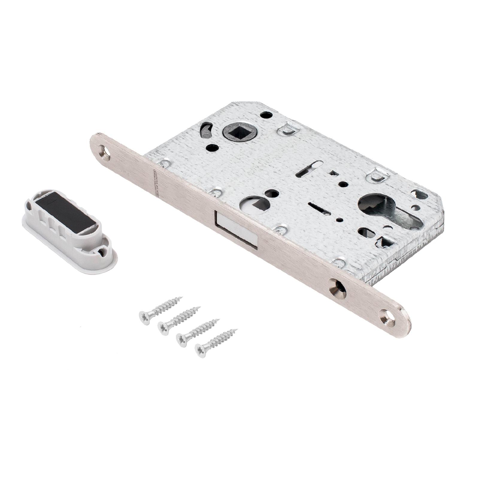 Универсальный магнитный врезной замок для установки на деревянные межкомнатные двери. Материал — сталь, гальваническое покрытие. Удаление ключевого отверстия — 50 мм. Межосевое расстояние — 85 мм. Овальная торцевая планка. Ширина планки — 18мм. Габариты корпуса — 132х74х15 мм. Засов из ударопрочного пластика. Цилиндровый механизм в комплект не входит.