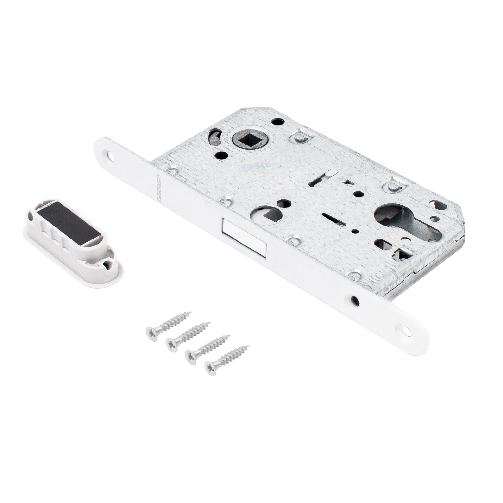 Универсальный магнитный врезной замок для установки на деревянные межкомнатные двери. Материал — сталь, полимерное покрытие. Удаление ключевого отверстия — 50 мм. Межосевое расстояние — 85 мм. Овальная торцевая планка. Ширина планки — 18мм. Габариты корпуса — 132х74х15 мм. Засов из ударопрочного пластика. Цилиндровый механизм в комплект не входит.