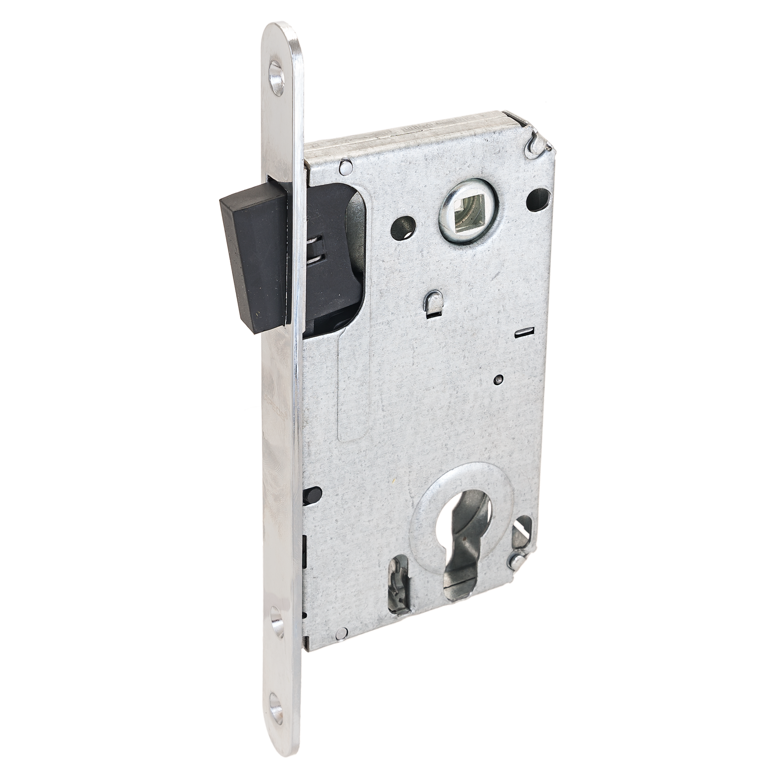 Магнитный замок для деревянных дверей. Под евроцилиндр. Межосевое расстояние 85 мм. Квадрат: 8 мм (ручки). Удаление квадрата под ручку 50 мм. Гальваническое покрытие лицевой планки, цвет хром.