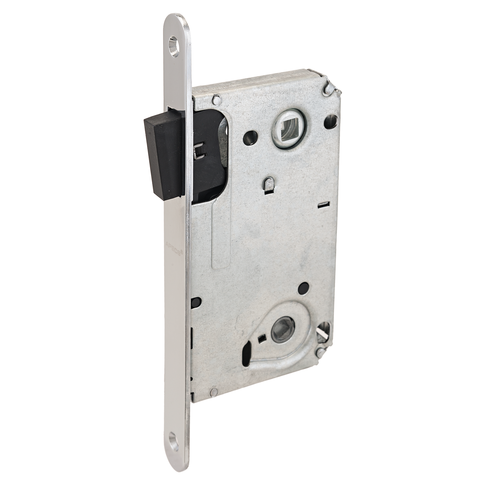 Магнитная защёлка врезная для установки на деревянные межкомнатные двери. Под ручку с квадратом 8 мм и сантехническую завертку с квадратом 6 мм. Материал — сталь оцинкованная, гальваническое покрытие. Удаление ключевого отверстия — 50 мм. Межосевое расстояние — 90 мм. Габариты корпуса — 131х73х14 мм.