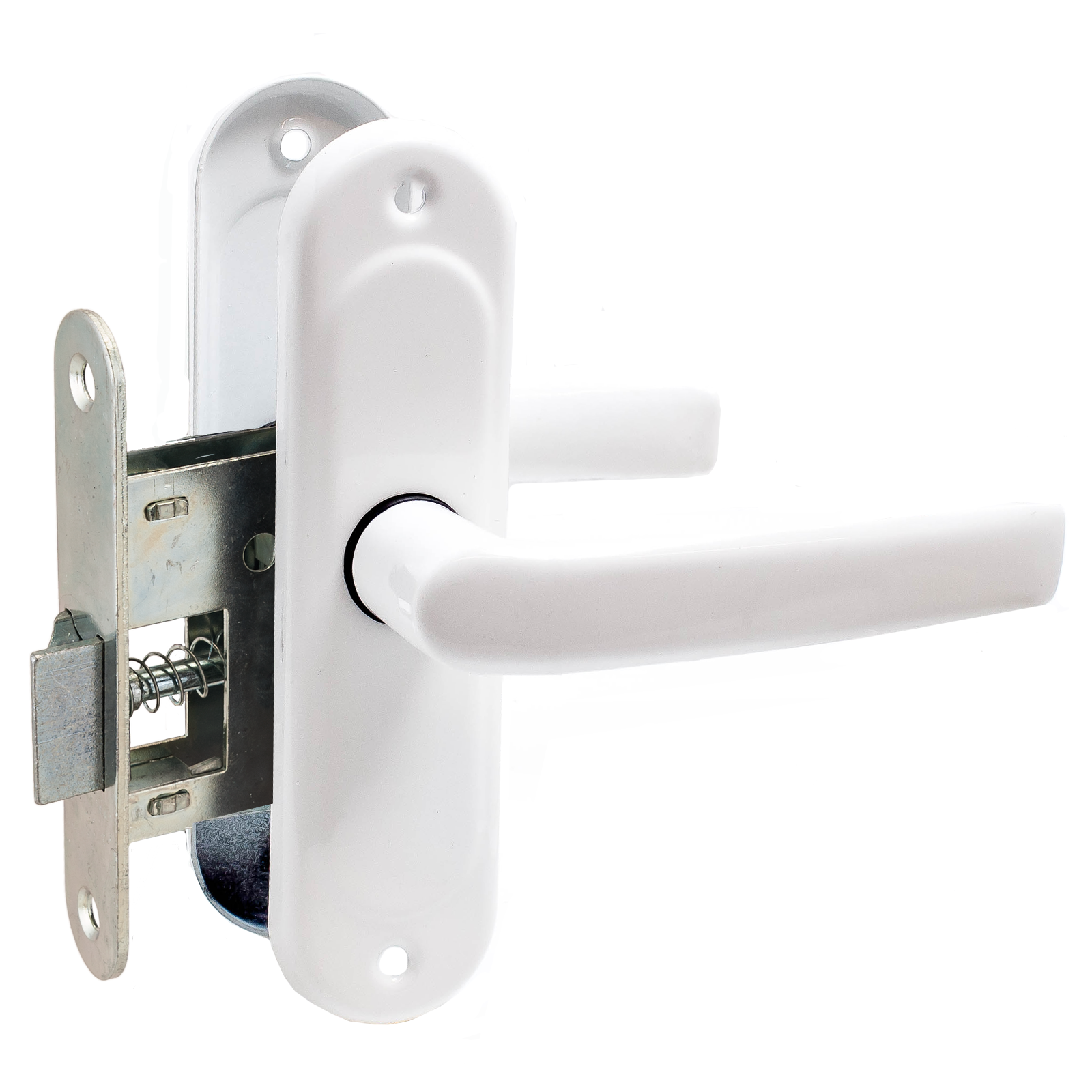 Защёлка с фалевыми ручками для установки на деревянные межкомнатные двери. Материал корпуса — сталь оцинкованная, материал защелки — цинковый сплав, ручек — алюминиевый сплав, сталь. Габариты корпуса — 70х60мм. Длина планки ручек — 150 мм, расстояние между крепежными отверстиями -125мм.