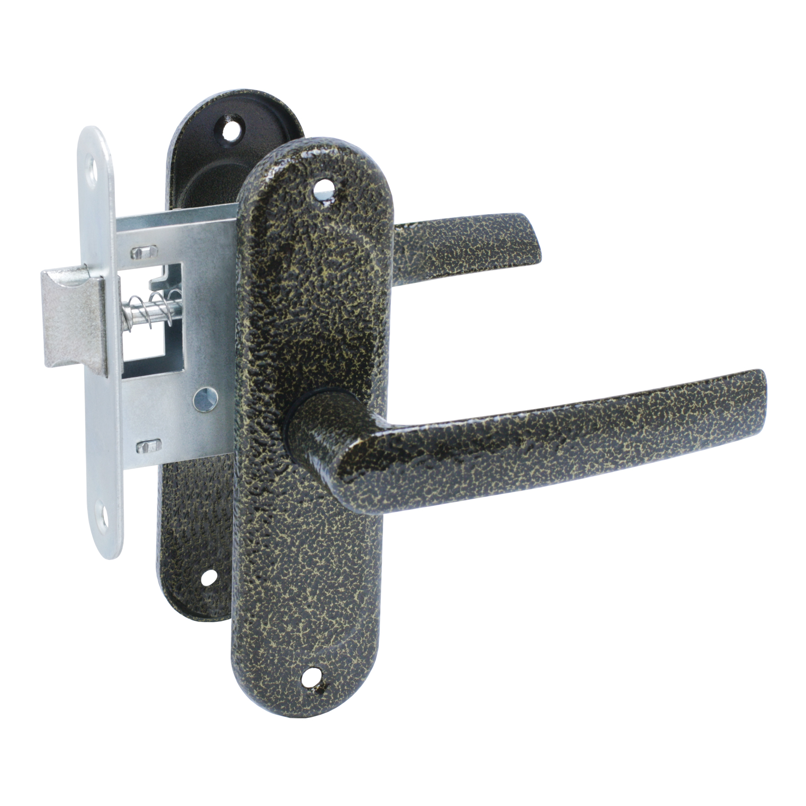 Защёлка с фалевыми ручками для установки на деревянные межкомнатные двери. Материал корпуса — сталь оцинкованная, материал защелки — цинковый сплав, ручек — алюминиевый сплав, сталь. Габариты корпуса — 70х60мм. Длина планки ручек — 150 мм, расстояние между крепежными отверстиями -125мм.