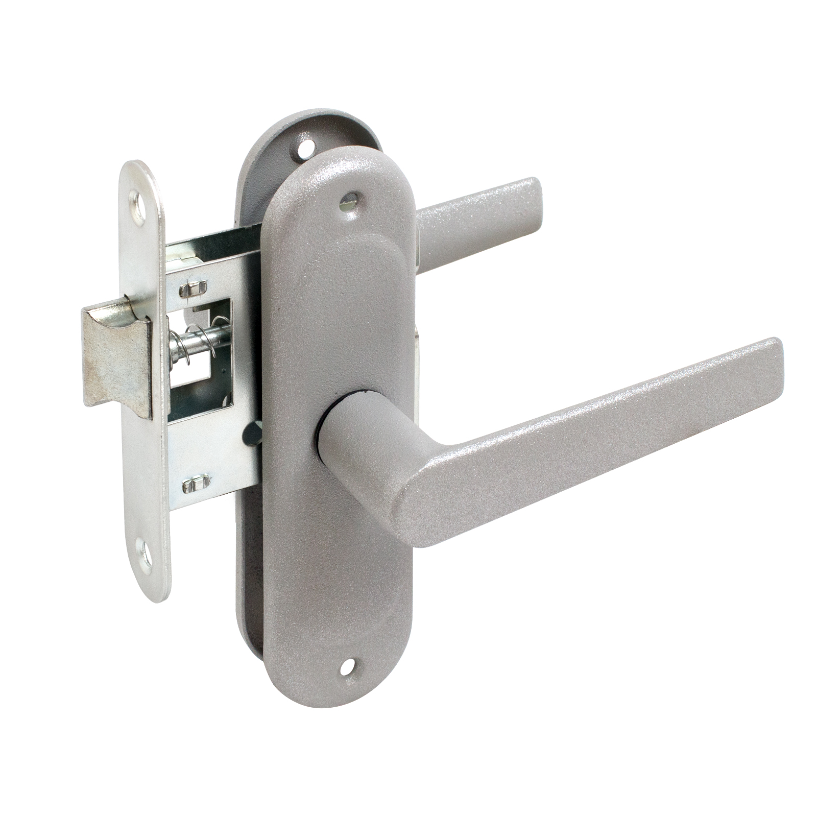 Защёлка с фалевыми ручками для установки на деревянные межкомнатные двери. Материал корпуса — сталь оцинкованная, материал защелки — цинковый сплав, ручек — алюминиевый сплав, сталь. Габариты корпуса — 70х60мм. Длина планки ручек — 150 мм, расстояние между крепежными отверстиями -125мм.